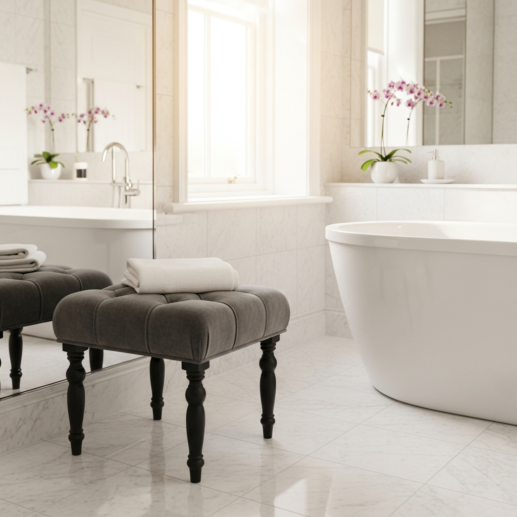 If space allows, add a small, elegant seating option. A padded stool, a chic armchair, or a decorative bench not only provides a place to sit while getting ready but also adds a touch of residential comfort. Choose materials like velvet, boucle, or a sleek wooden design to complement your aesthetic.