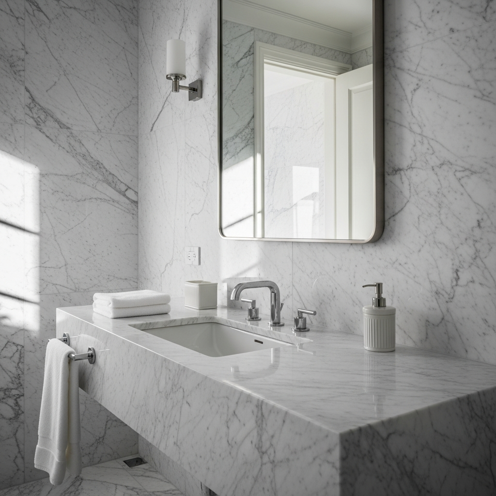 Nothing says luxury quite like marble. Incorporating this natural stone into your bathroom, whether through a sleek countertop, an accent wall, or even elegant accessories, instantly elevates the space. The cool, smooth texture and unique veining patterns add a timeless sophistication. Pair it with warm lighting to highlight its natural beauty.