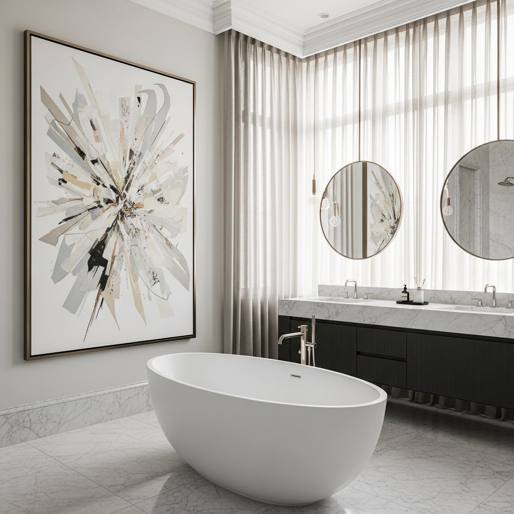 Do not overlook your walls. A well-chosen piece of art can introduce color, texture, and personality. Select a framed print, an abstract painting, or even a chic gallery wall that complements your bathroom’s style. Ensure the art is suitable for a humid environment or well-protected to maintain its quality. This touch adds a sophisticated, curated feel.