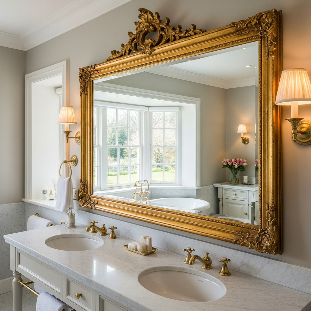 A generously sized mirror not only serves a practical purpose but also makes a bathroom feel larger and brighter. Opt for a mirror with an interesting frame โ perhaps an antique gold, a sleek black, or an art deco design. A floor-length mirror can also add a dressing-room feel, enhancing the sense of space and luxury.