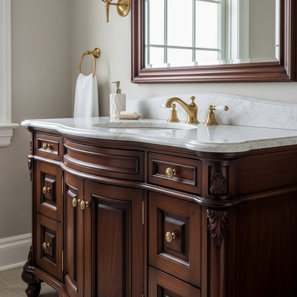 While white and grey are common in bathrooms, a vanity crafted from rich, dark wood such as walnut or mahogany introduces warmth and a sense of heirloom quality. The deep tones of the wood contrast beautifully with lighter tiles or marble, adding depth and a touch of traditional luxury. Look for custom cabinetry with elegant hardware.
