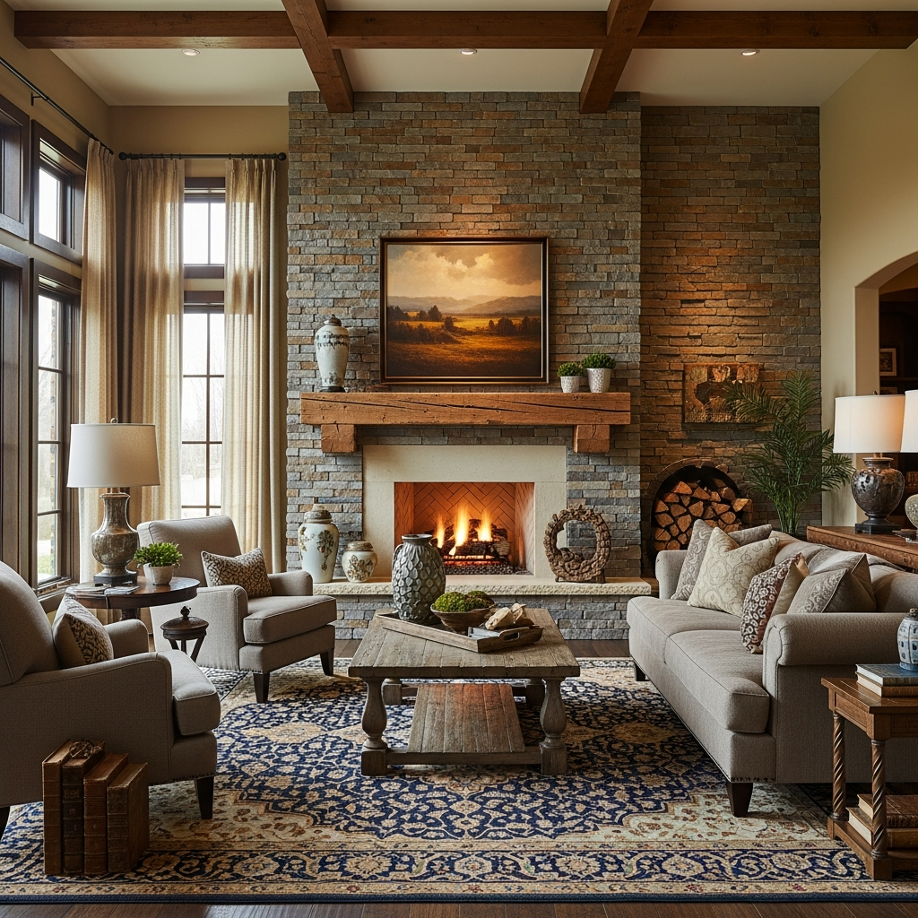 This accent wall creates a robust, grounded, and luxurious atmosphere, especially impressive around a fireplace. Combine with sturdy wooden furniture, leather sofas, and cozy throws for a comforting retreat.