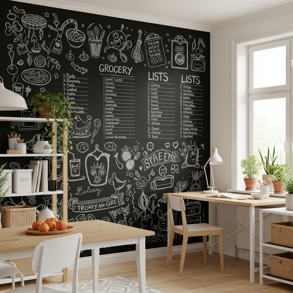 This creates a playful, casual, and highly functional mood, perfect for kitchens, playrooms, or home offices. Pair with simple, practical furniture and colorful accessories to balance the dark wall.