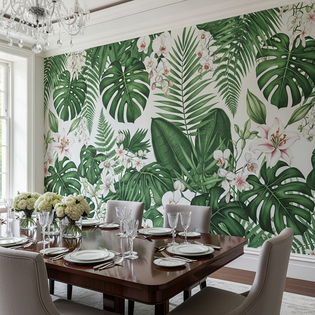 Immerse your room in nature with a large-scale botanical wallpaper mural. These often feature oversized leaves, exotic flowers, or serene landscapes, creating a stunning, immersive effect. The color palettes tend to be organic, with shades of green, earthy browns, and soft floral tones.
