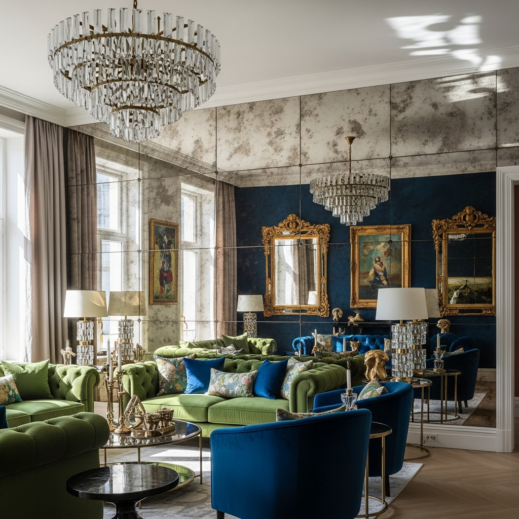 Mirrored wall panels are a brilliant way to expand a space, reflect light, and add a touch of glamour. You can use full sheets, smaller individual panels, or even antique-finished mirrors for a vintage vibe. The reflective surface introduces incredible depth and sparkle.