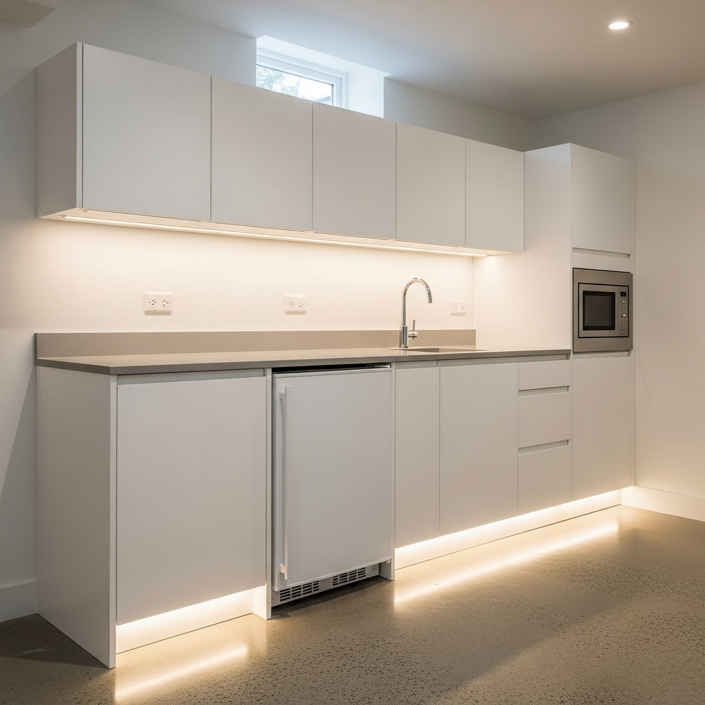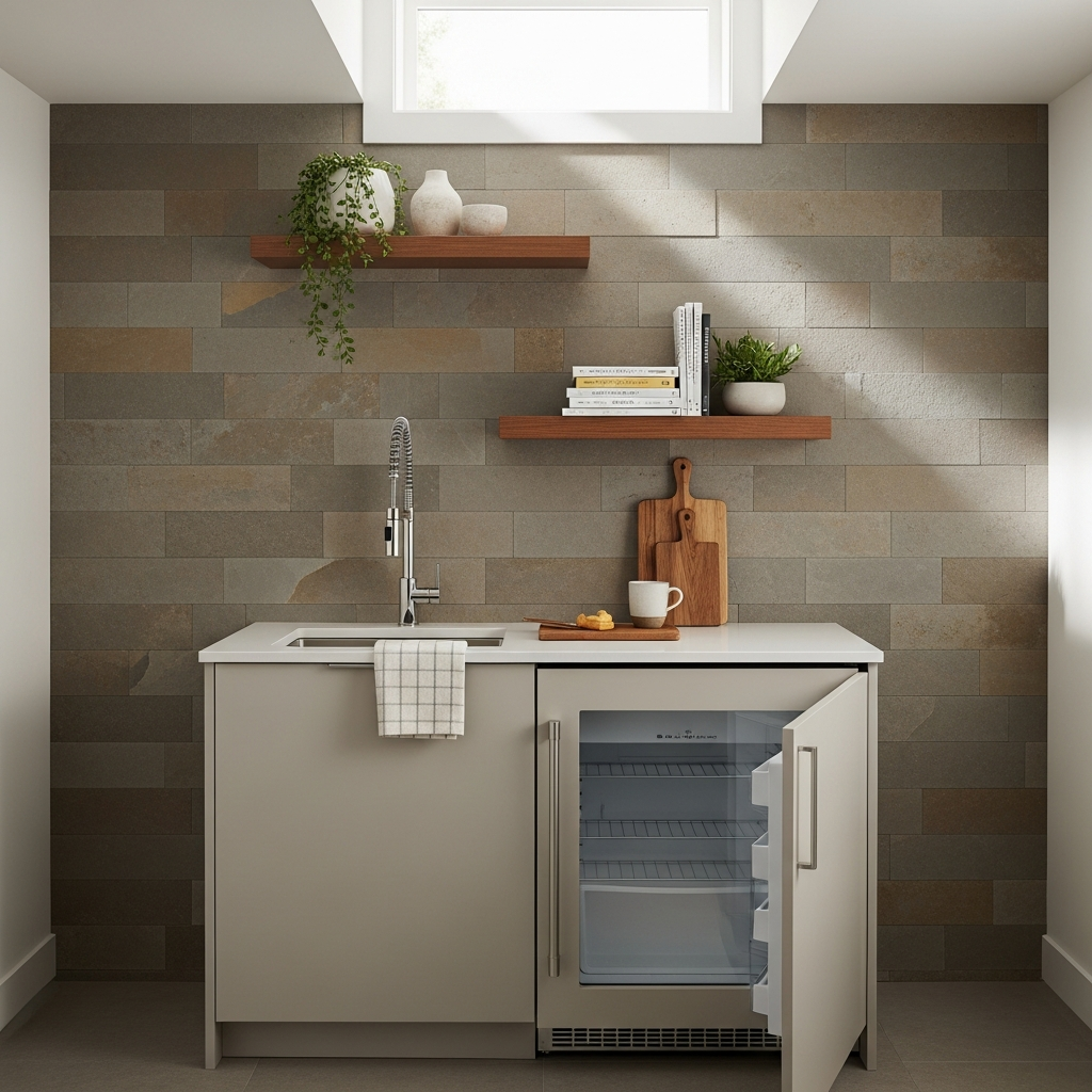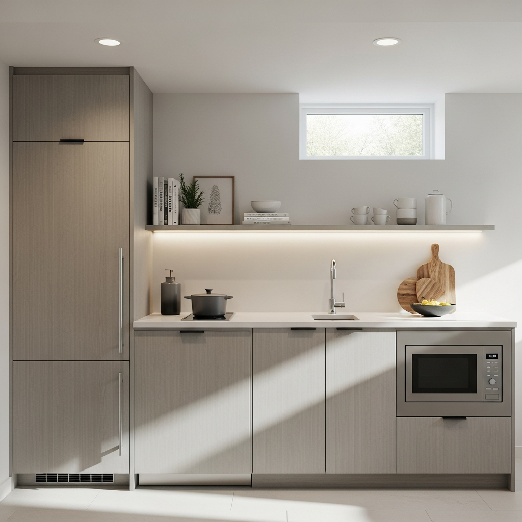 For the ultimate sleekness, hide all your appliances behind integrated cabinet panels. This creates a completely streamlined look, making the kitchenette disappear when not in use. This works wonderfully with flat-panel cabinetry in any color, from crisp white to warm wood. The result is an uncluttered space that can easily transition into a living or entertainment area, offering both style and discretion.