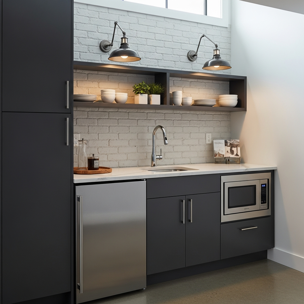 Capture the essence of city living with an urban loft kitchenette. Dark gray or charcoal cabinetry, stainless steel appliances, and open shelving made from pipe and wood can define this look. Consider a simple subway tile or even a raw concrete finish for the backsplash. The mood is cool, sophisticated, and functional, ideal for a modern living space with a bit of an edge.
