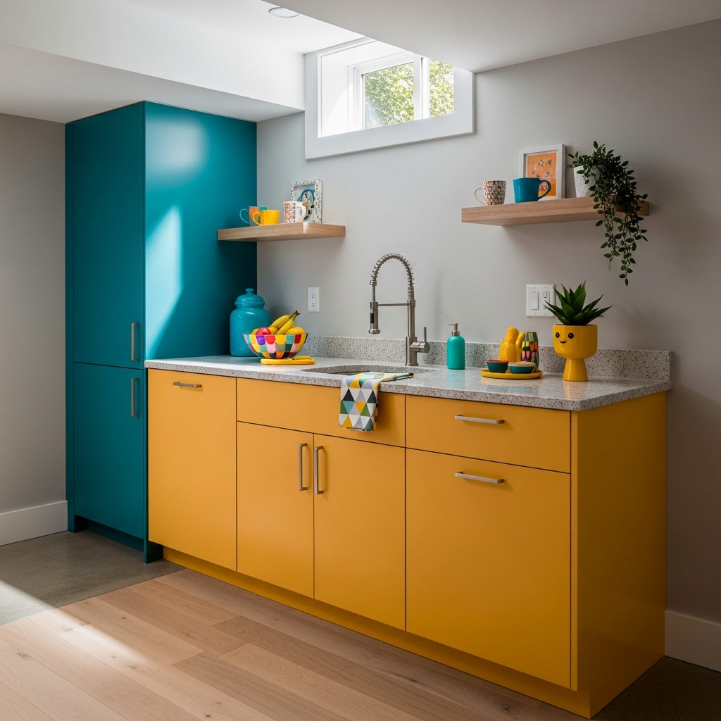 Inject personality with a bold color choice for your cabinetry. A pop of emerald green, bright teal, or sunny mustard yellow on a small run of cabinets can instantly energize the basement. Keep surrounding walls neutral to let the color shine. Pair with simple, modern hardware and perhaps some whimsical artwork. This approach turns a functional area into a lively design statement.