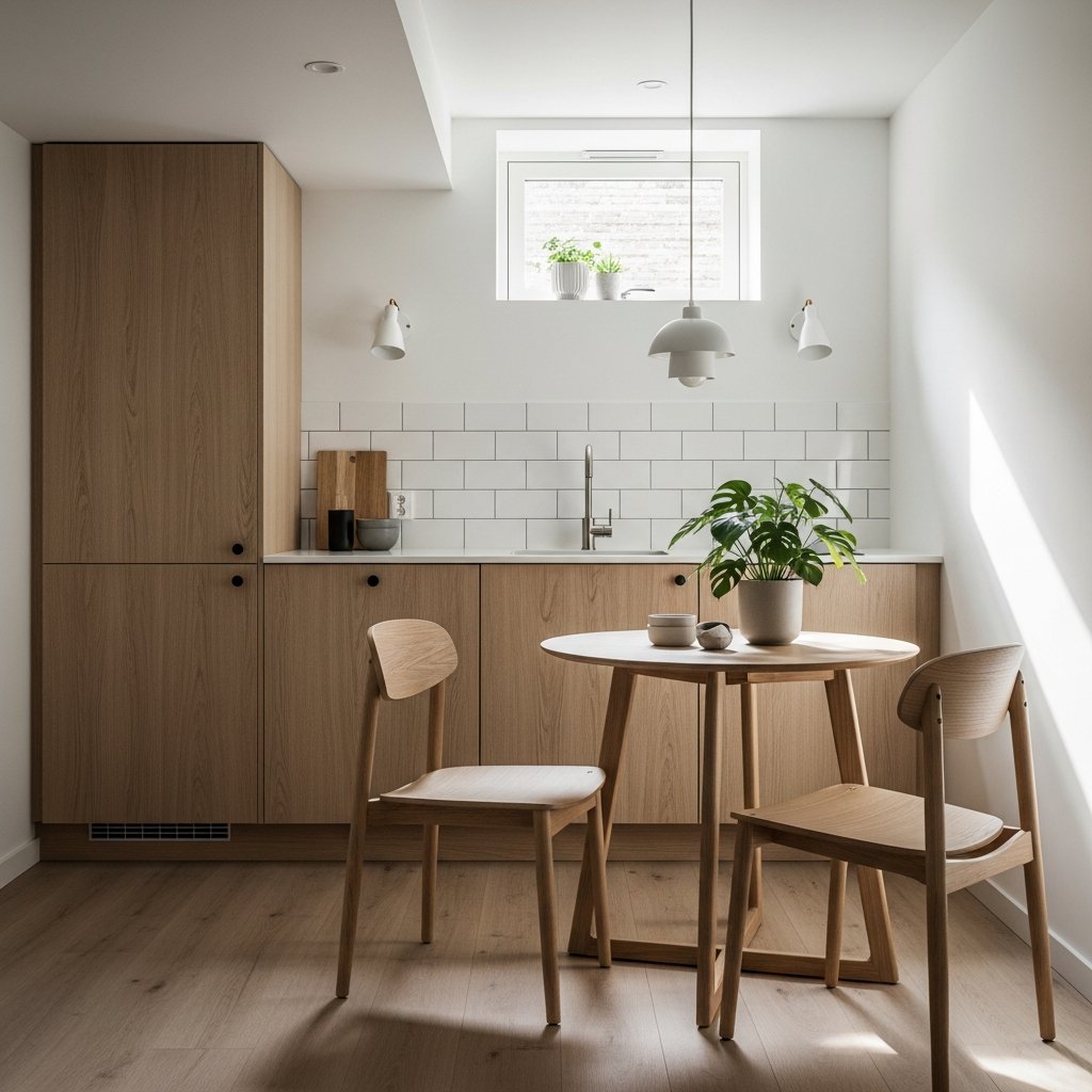 Channel the ‘hygge’ feeling with light wood cabinetry, white subway tiles, and a simple, functional layout. Focus on natural light and reflective surfaces. Small, functional furniture pieces, like a round bistro table, fit perfectly. A minimalist color palette of whites, grays, and natural wood tones creates an airy, calming environment that feels larger than it is. Add a small potted plant for a touch of life.