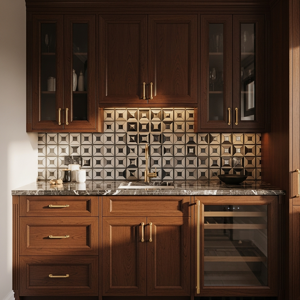 Infuse glamour with an Art Deco theme. Think rich, dark wood cabinetry, polished gold or brass hardware, and a backsplash featuring geometric patterns in tiles or wallpaper. A small, chic bar cart can serve as an extension. The color palette might include deep jewel tones like emerald or sapphire, alongside classic black and gold, creating a sophisticated and lavish atmosphere perfect for entertaining.