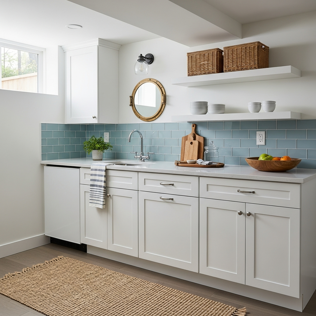 Bring the beach house charm to your basement with a coastal theme. Think crisp white shaker cabinets, light blue or seafoam green backsplash tiles, and natural textures like wicker or rattan accents. Chrome or brushed nickel hardware completes the look. The color palette revolves around whites, blues, and sandy beiges, creating a serene and refreshing atmosphere, even without a view of the ocean.