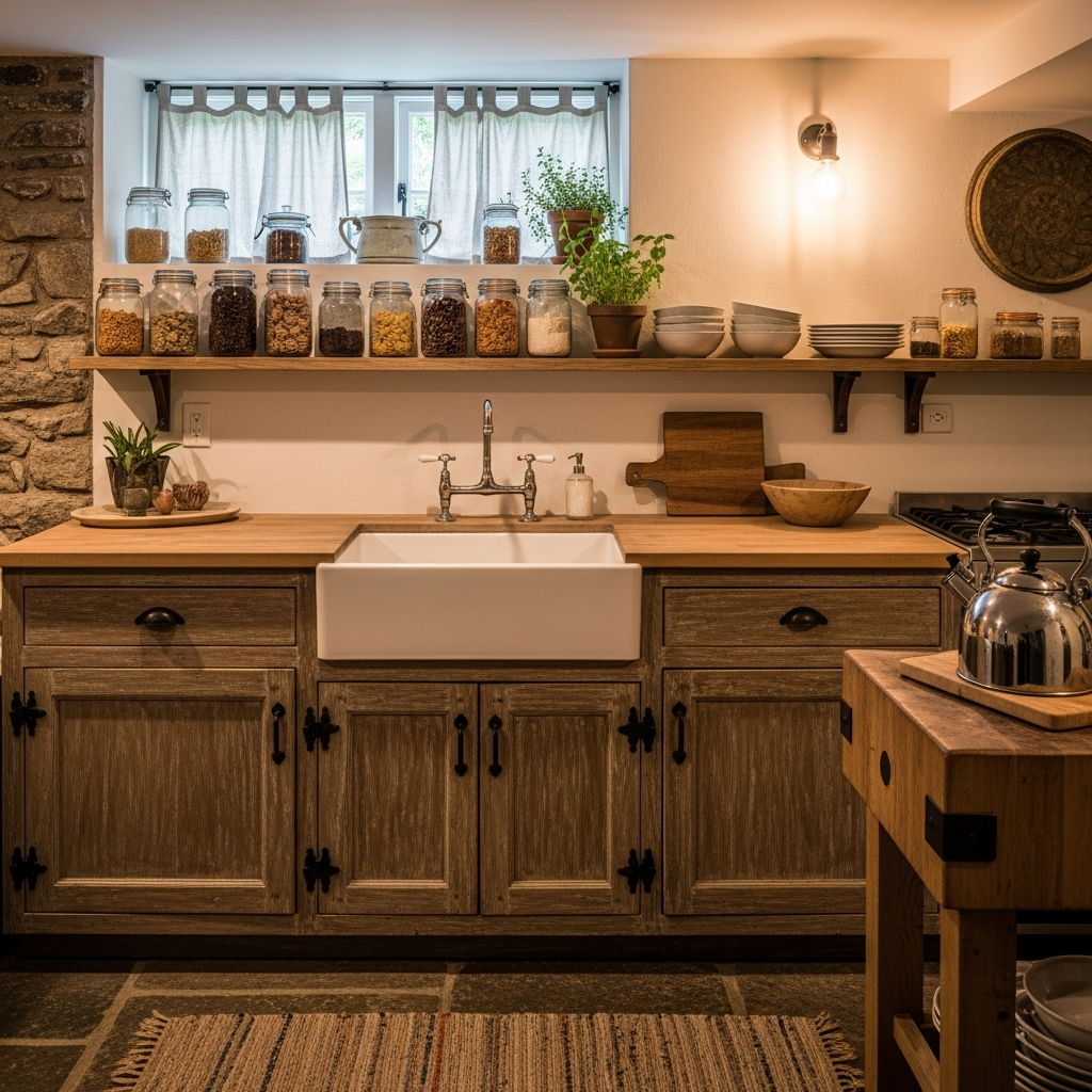 Create a charming, homey feel with distressed wood cabinets, a deep farmhouse sink, and open shelving displaying vintage dishes. A shiplap accent wall can enhance the rustic vibe. Stick to a palette of creams, soft greens, and warm browns. Incorporate textures like woven baskets and linen towels. This design evokes comfort and a sense of history, ideal for a welcoming guest space.