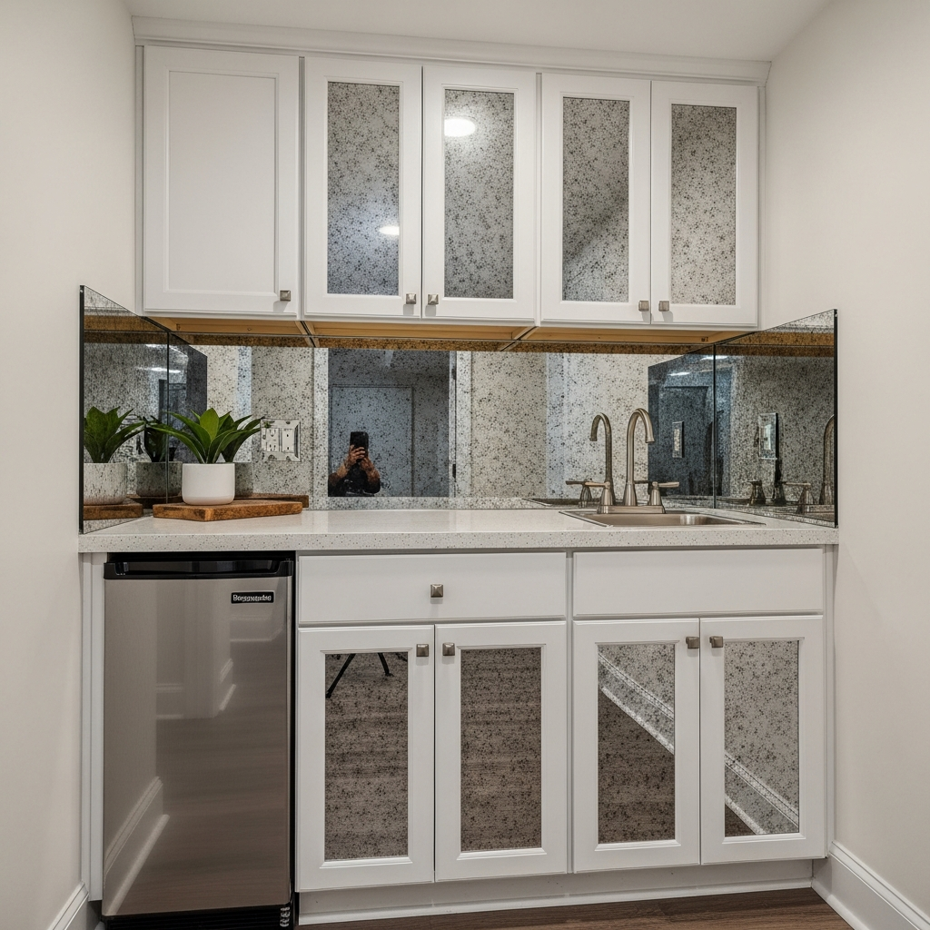 Use mirrors strategically to create the illusion of more space and light. A mirrored backsplash or cabinet panels can dramatically open up a small basement kitchenette, reflecting ambient light and architectural details. Combine with light-colored cabinetry and clear glass elements to maximize the effect. The mood becomes expansive and elegant, defying the typical basement feel.
