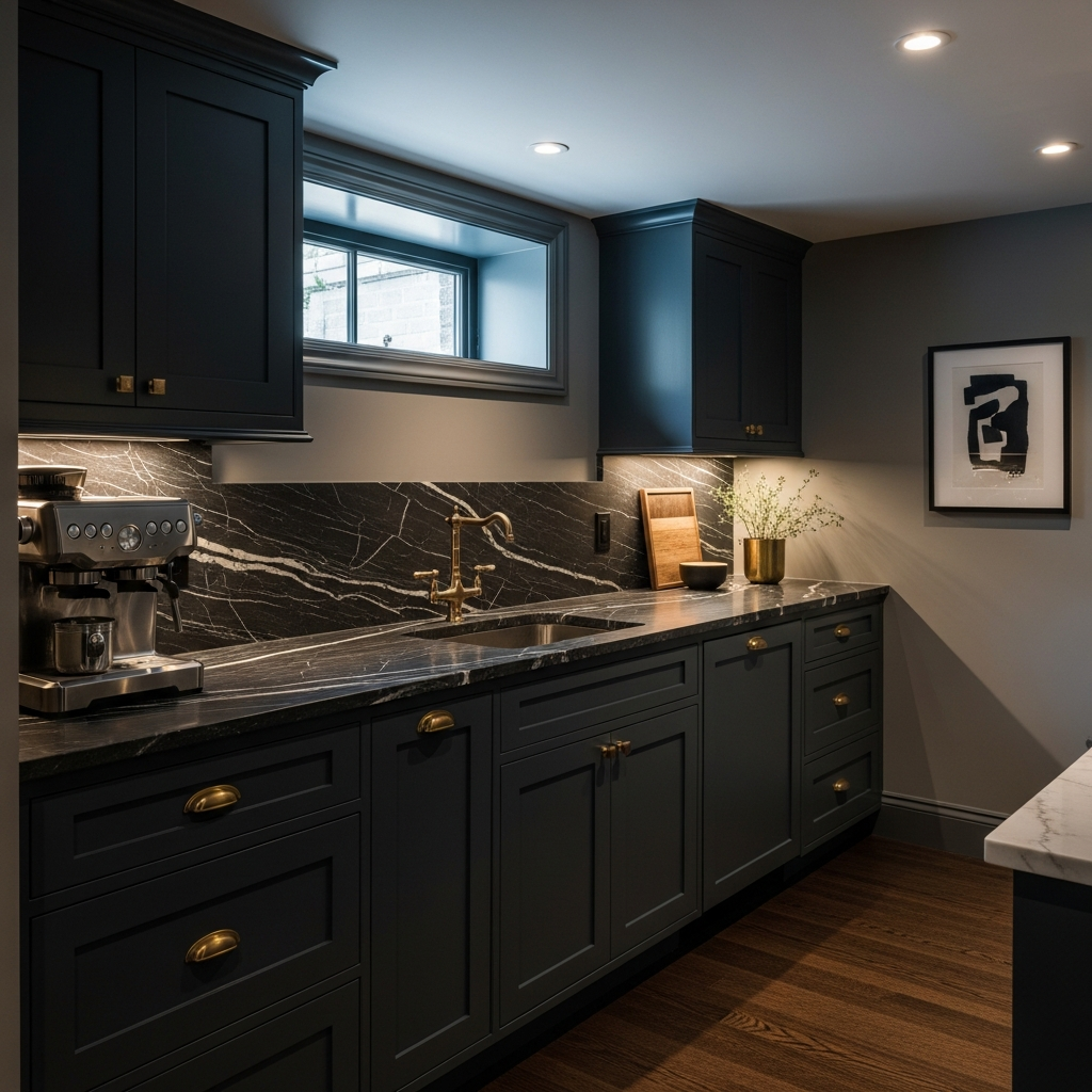Don’t shy away from darker tones in a basement. Deep navy, charcoal gray, or even black cabinets can create a surprisingly sophisticated and intimate kitchenette. Pair them with rich materials like dark marble or granite countertops and brass hardware for a touch of luxury. Soft, strategic lighting can highlight key features, making the space feel opulent and inviting, rather than enclosed.