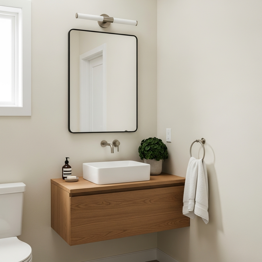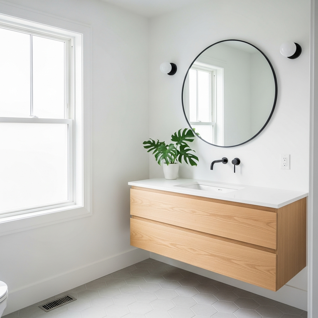 Consider a rustic wooden vanity, matte gold fixtures, and woven baskets for storage. The vibe is natural, balanced, and effortlessly chic, creating a tranquil oasis.