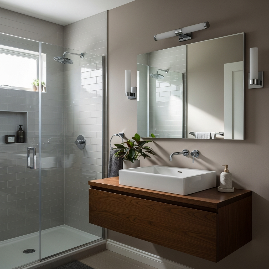 Consider matte black hardware, concrete countertops, and plush linen towels to enhance its understated elegance. The atmosphere is calming, grounded, and subtly luxurious.