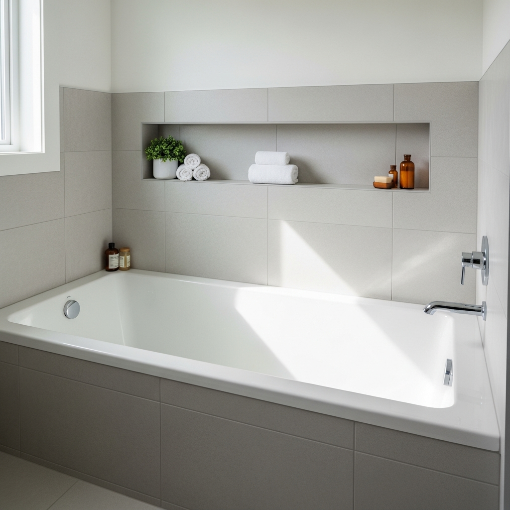 For a seamless and organized spa experience, a built-in alcove tub with integrated niches offers both practicality and understated style. It creates a cohesive and visually pleasing bathing zone.