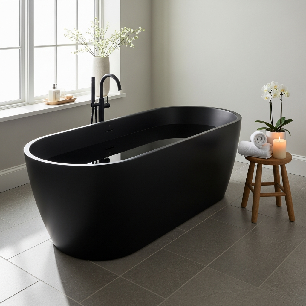 Envision a sleek, matte black freestanding tub contrasting beautifully with light wood floors or soft white walls, accented with brushed gold or copper fixtures. The deep color choice creates a sense of intimacy and luxury. The atmosphere is moody, chic, and incredibly inviting, perfect for a luxurious escape.