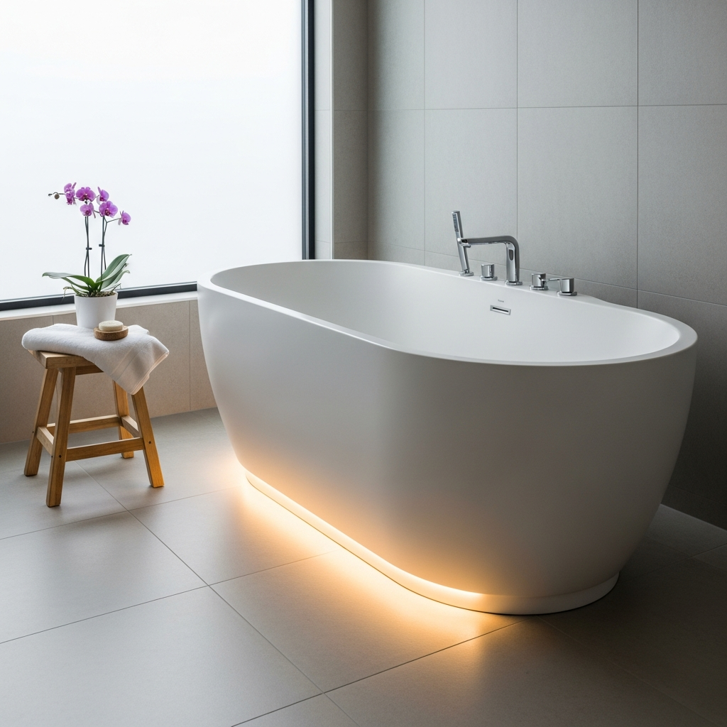 Envision a contemporary tub with discreet LED strips illuminating its base or edges, casting a soft glow. The tub itself could be a simple, clean form in white or a translucent material. The lighting can be adjustable, allowing for different color temperatures or hues. The mood is ethereal, calming, and truly transformative.