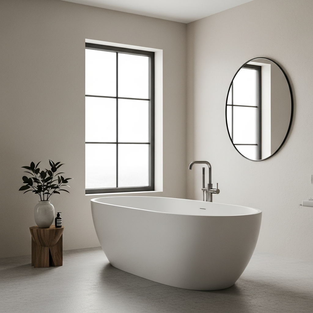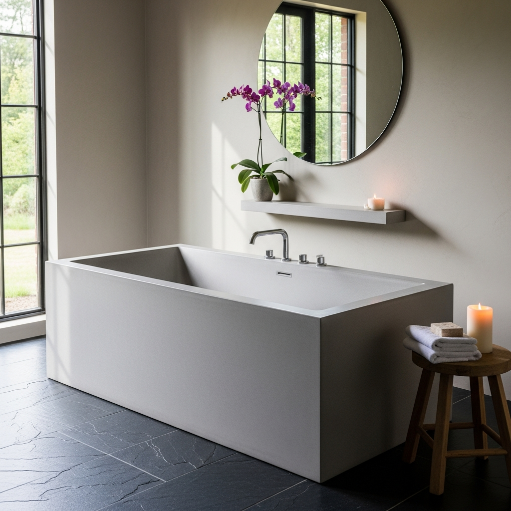 Picture a sleek, deep rectangular tub in a matte white or light grey finish, nestled against walls of pale concrete or large-format tiles. Minimalist brass or black fixtures complete the refined look. The atmosphere here is one of calming efficiency and sophisticated calm, perfect for a truly restorative soak.