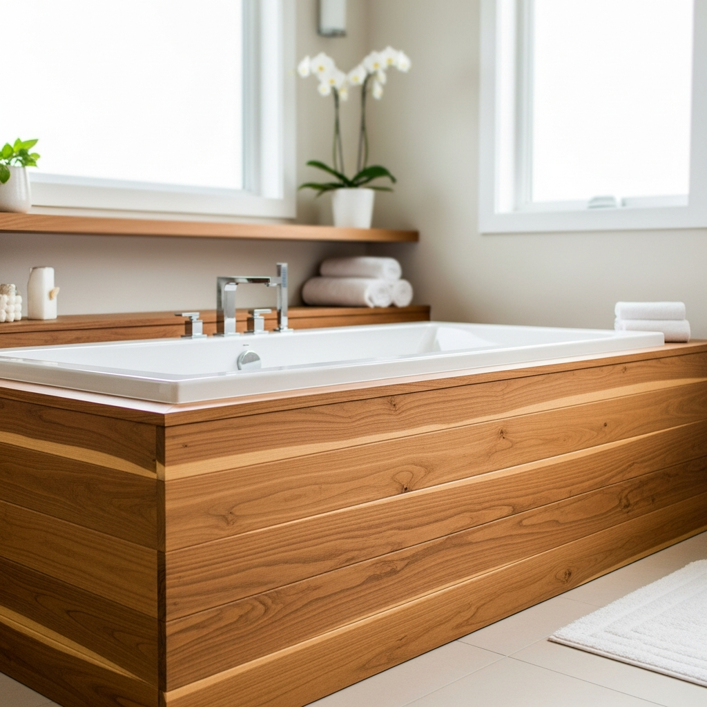 Consider a simple, clean-lined tub surrounded by meticulously fitted planks of light oak or warm walnut, perhaps extending up the wall. The color palette centers on natural wood tones, crisp whites, and gentle greens. The atmosphere is inviting, organic, and incredibly soothing, perfect for a peaceful evening soak.