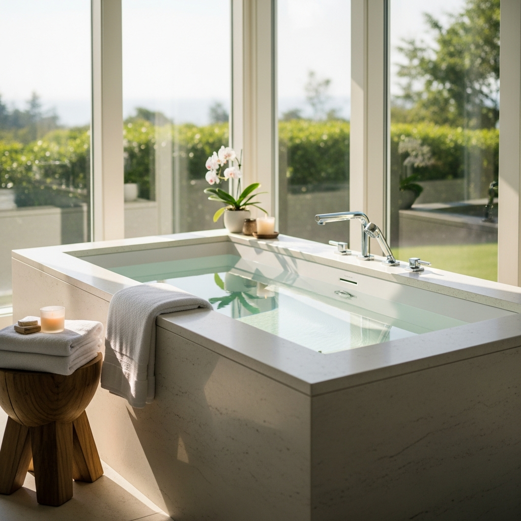 Often found in clean white acrylic or composite materials, these tubs are best set in a contemporary bathroom with crisp, clean finishes. Think large, neutral-toned tiles and simple, functional designs. The atmosphere is one of active relaxation and revitalization, focusing on physical well-being.