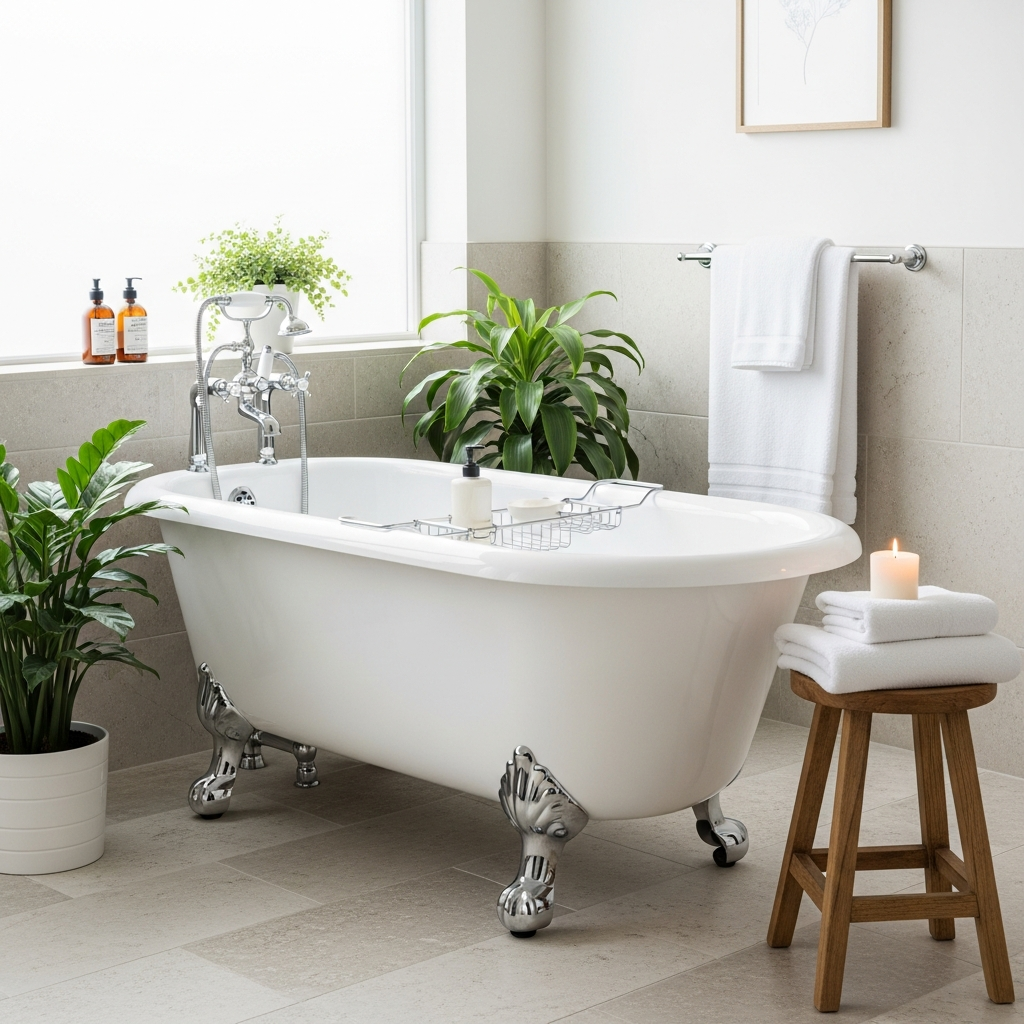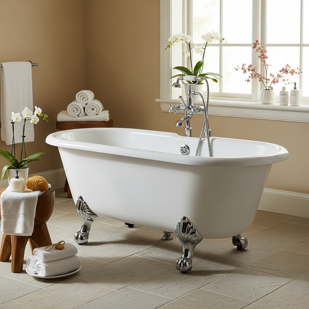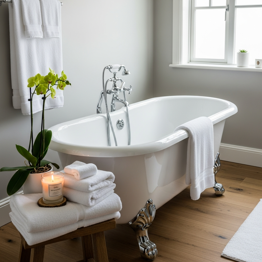 Imagine a bright white, roll-top clawfoot tub with ornate polished brass or oil-rubbed bronze feet, set against a backdrop of soft sage green or powdery blue walls. Add plush, absorbent towels and perhaps a small antique stool nearby. The mood is nostalgic, romantic, and utterly charming, encouraging long, leisurely soaks.