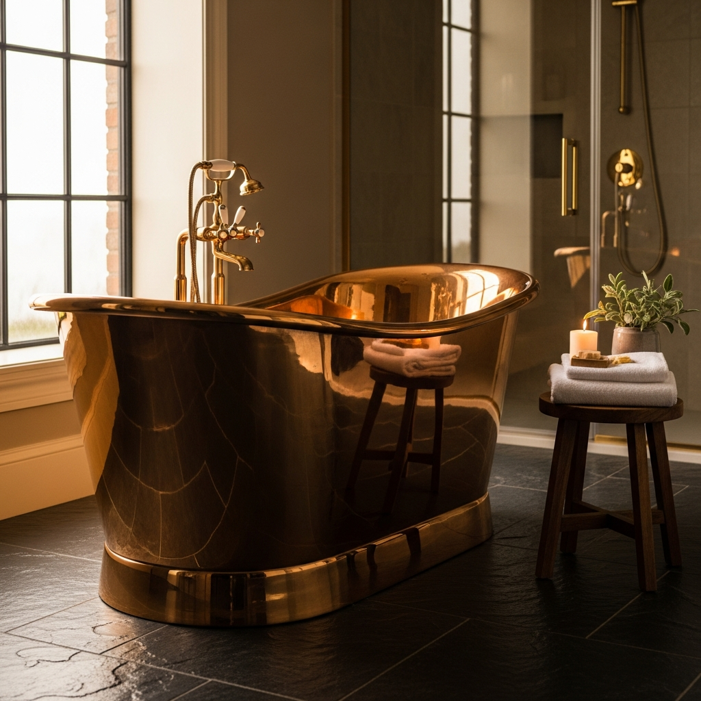 Visualize a handcrafted copper tub with a rich, evolving patina, gleaming softly against dark, moody walls or earthy-toned tiles. Polished fixtures in matching or contrasting metals enhance the luxurious feel. The mood is one of old-world extravagance and romantic indulgence, offering a truly unique bathing experience.