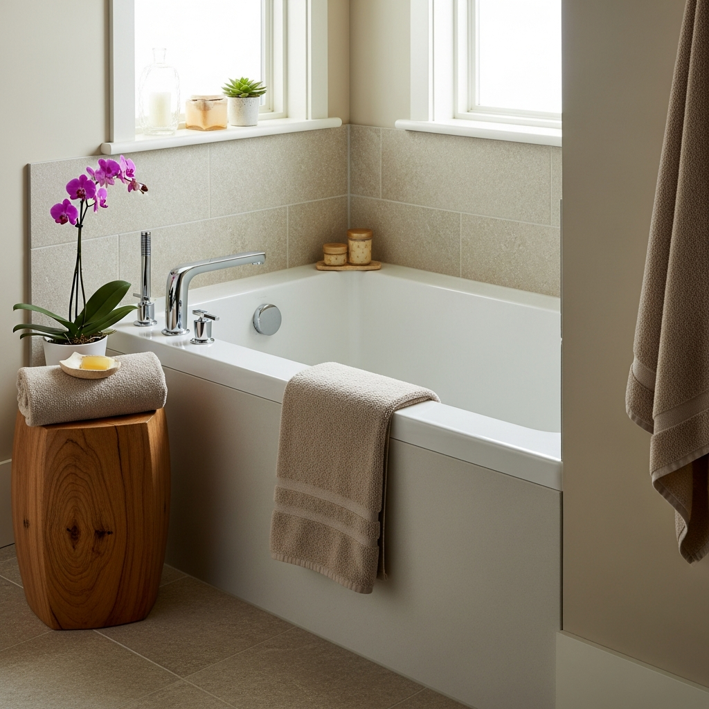 Consider a crisp white acrylic or porcelain tub surrounded by subway tiles in a light neutral, with a recessed niche in the same tiling for bath salts and candles. A small, handcrafted wooden bath caddy can bridge the gap. This setup fosters a cozy, organized, and inviting atmosphere, perfect for a compact yet luxurious spa feel.