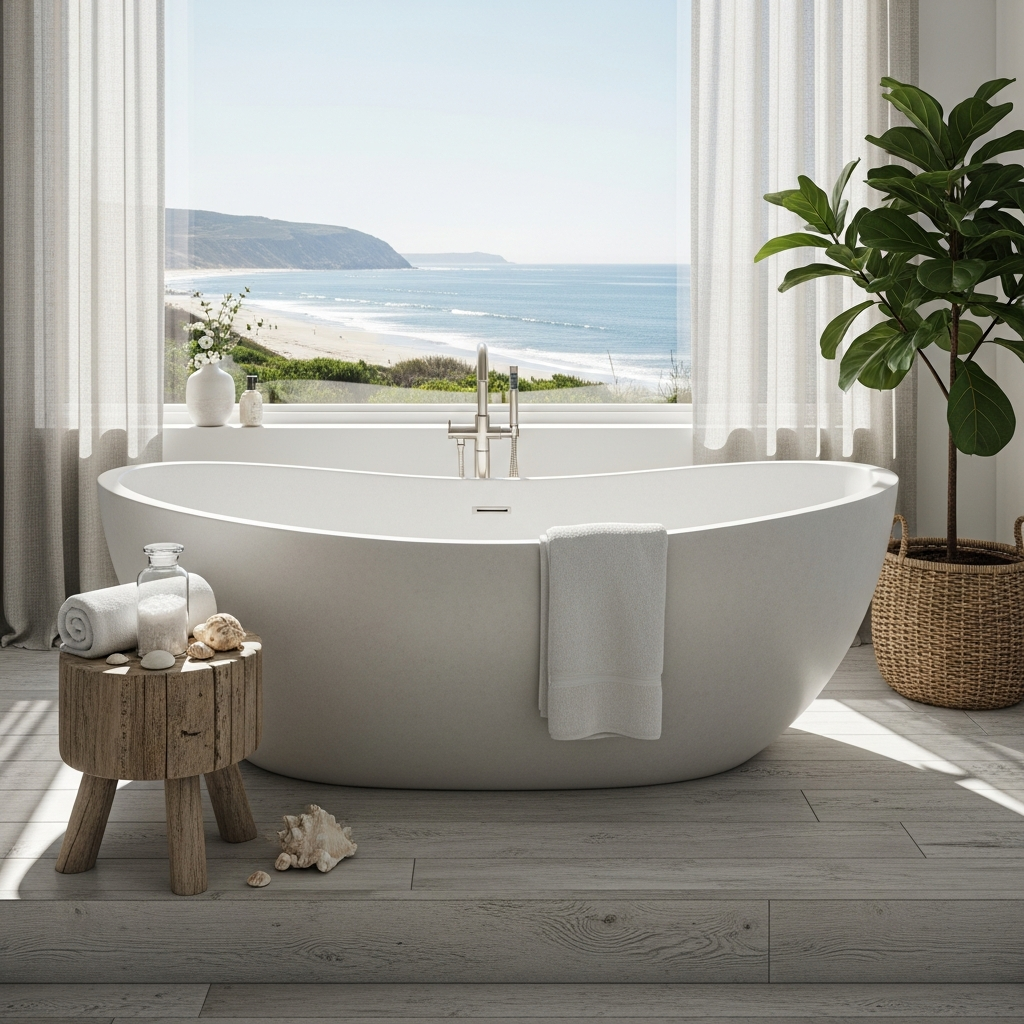 Bring the refreshing, airy feel of the seaside into your bathroom with a coastal-inspired bathtub setup. It’s about light, natural textures, and a breezy, rejuvenating atmosphere.