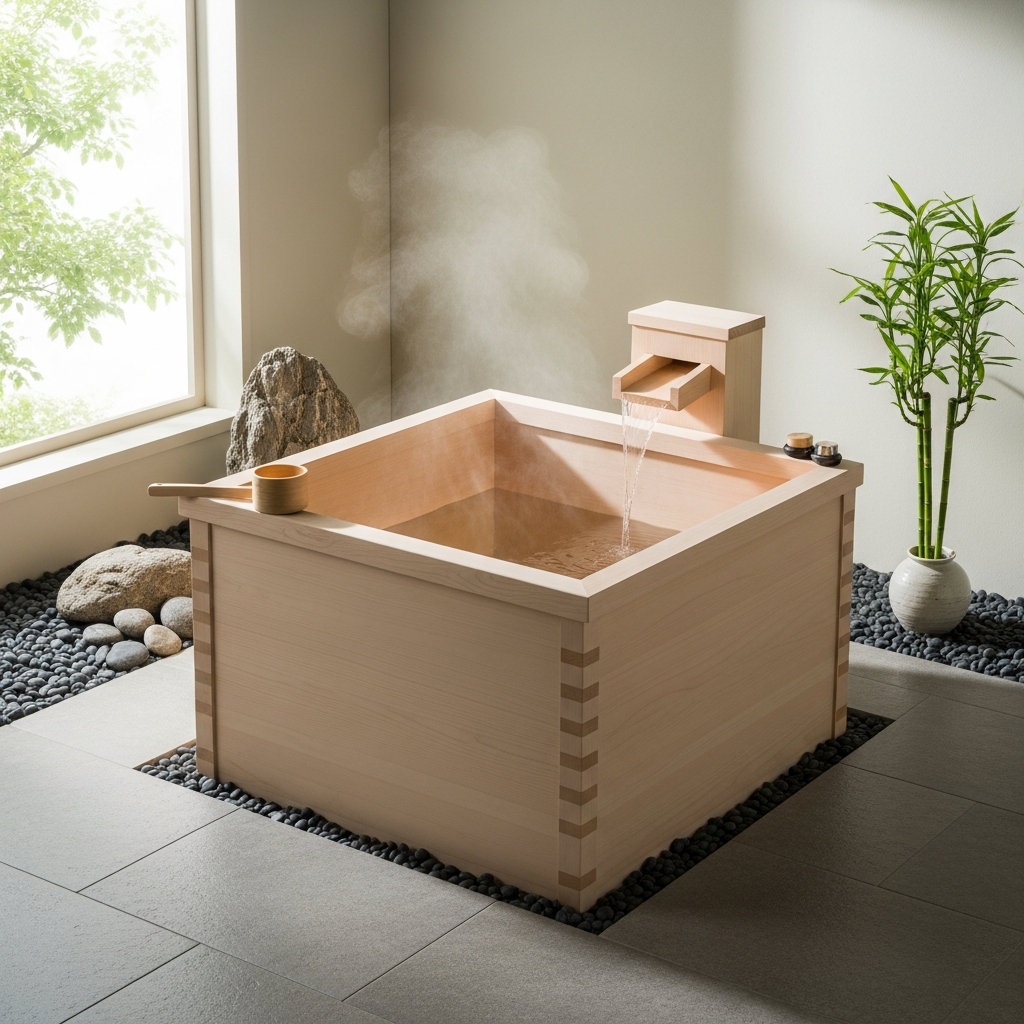 Typically crafted from fragrant cedar or hinoki wood, the warm, natural grain of the wood sets the tone. Walls might be soft grey or off-white, with simple, clean lines. Essential accessories include a small stool and natural scrub brushes. The atmosphere is one of serene contemplation and deep, therapeutic warmth.