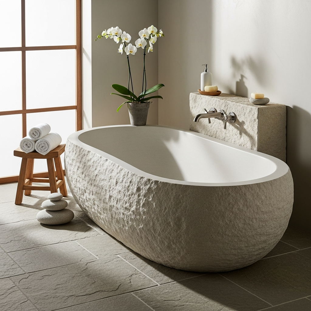 Indulge in organic luxury with a bathtub carved from natural stone. This striking choice brings an earthy, grounding element directly into your bathroom, connecting you with nature.
