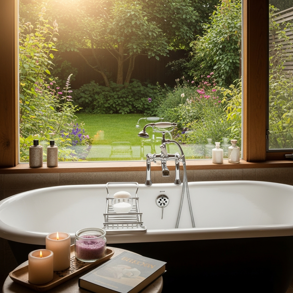 Imagine a deep, wide tub positioned perfectly to gaze out a large window onto verdant foliage or blooming flowers. The materials of the tub itself can be simple, letting the view be the star. The color palette pulls from nature, creating an airy and refreshing mood that feels incredibly peaceful and invigorating.