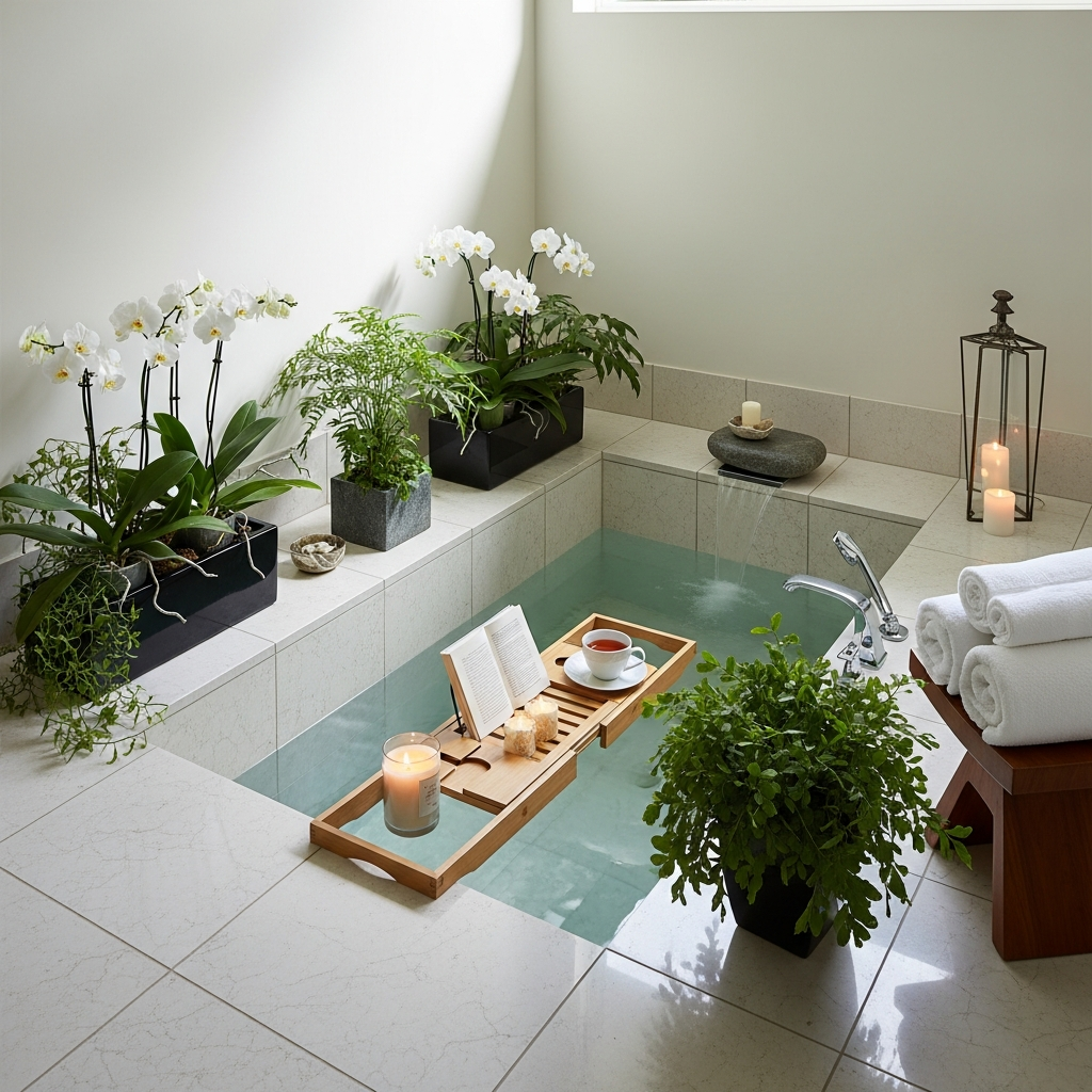 Imagine a beautiful tub, perhaps a modern freestanding design, raised on a low platform made of warm wood or polished stone. Subtle steps lead up to this private retreat. This design cultivates a sense of occasion and ritual, making every bath feel like a special event in a designated sanctuary.
