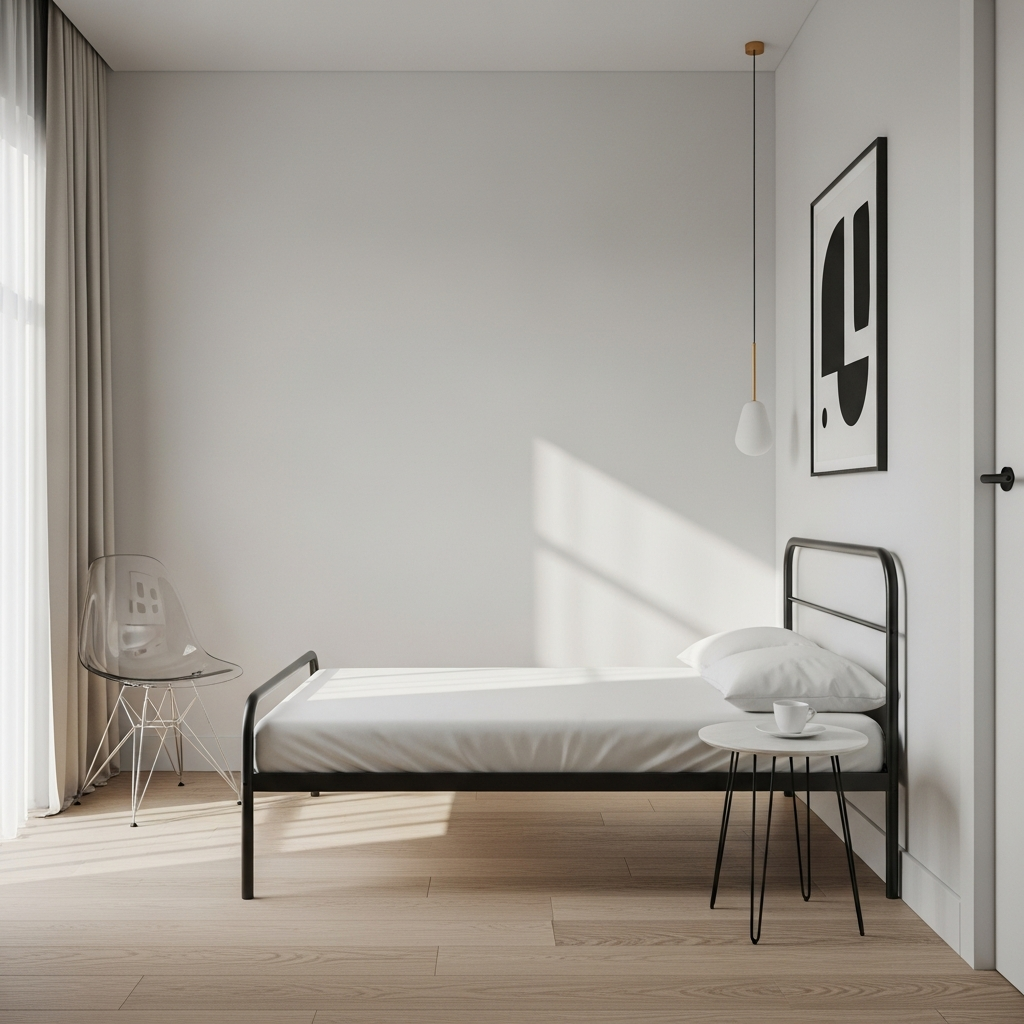 Choose furniture with a light visual footprint. Pieces with thin legs, open designs, or transparent materials (like acrylic chairs or glass tabletops) allow light to pass through and prevent the room from feeling heavy. A bed frame with a minimalist metal or slim wooden frame works wonders. A simple, monochromatic color scheme, such as white with charcoal grey accents, reinforces the airy and sophisticated mood. This style emphasizes simplicity and elegance.