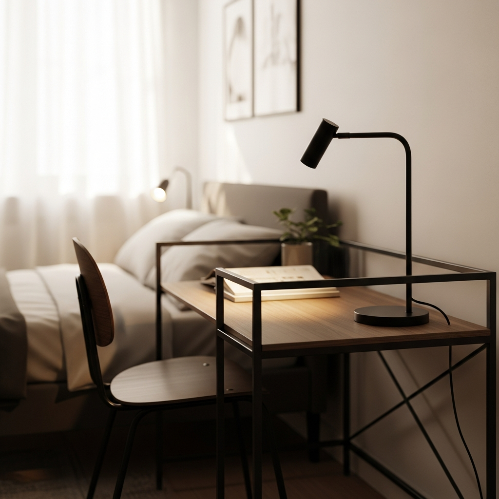 Why have two separate pieces when one can do the job? If you need a workspace, place a narrow, sleek desk right next to your bed and let it pull double duty as your nightstand. This clever arrangement saves valuable floor space. Choose a desk with a clean silhouette, perhaps a black metal frame with a light wood top. Keep the desktop clear, adding only essential items like a stylish task lamp and a small notebook. This creates a highly functional and streamlined zone.
