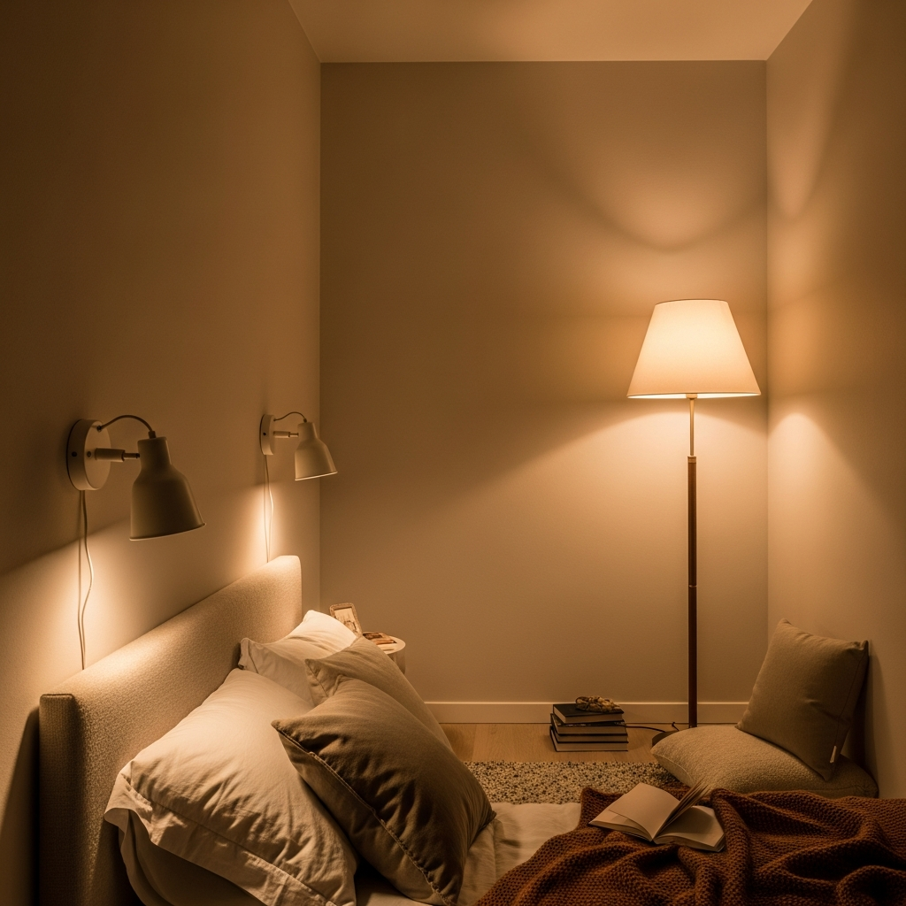 Thoughtful lighting can dramatically impact how spacious a room feels. Instead of bulky table lamps, opt for wall-mounted sconces or pendant lights that free up nightstand space. A tall, slender floor lamp in a corner can provide ambient light without taking up much room. Layers of lighting create depth and warmth. Choose warm LED bulbs to cast a welcoming glow, especially in a soft neutral palette of creams and beiges, enhancing comfort and intimacy.