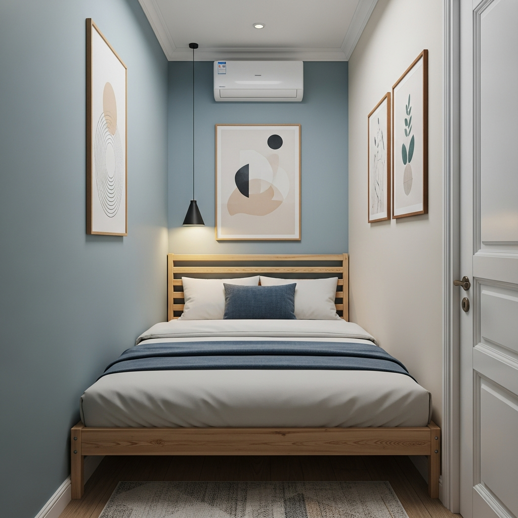 Sometimes the simplest solution is the best. Positioning your bed against the longest available wall immediately frees up floor space, making the room feel more open. Opt for a bed frame with a sleek, low profile in a light wood or upholstered fabric. Complement this with a soft, neutral color palette, perhaps warm grays or muted blues, which visually expands the room. Add a thin, wall-mounted headboard or art piece above to maintain clean lines.