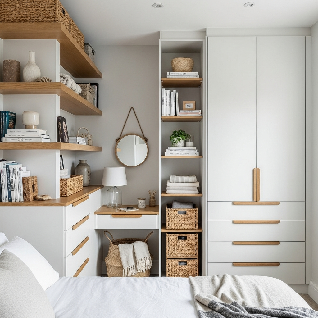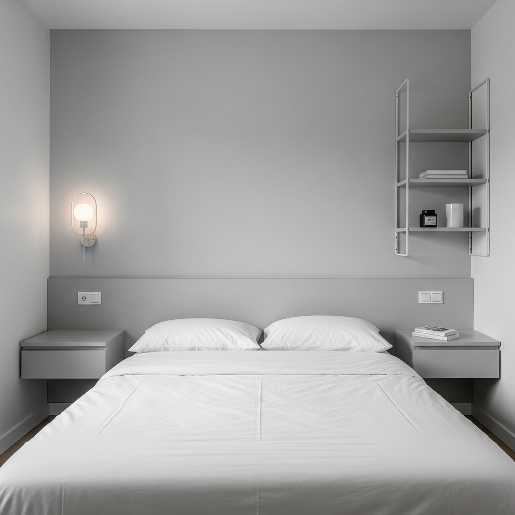 If your budget allows, custom built-in furniture is the ultimate small-space solution. Built-ins can cleverly integrate storage, shelving, a desk, and even the bed frame itself into one cohesive unit that perfectly fits the room’s dimensions. This eliminates wasted space and creates a streamlined, intentional look. Paint the built-ins the same color as the walls, perhaps a soft grey or a pale greige, to make them blend seamlessly and feel less bulky.