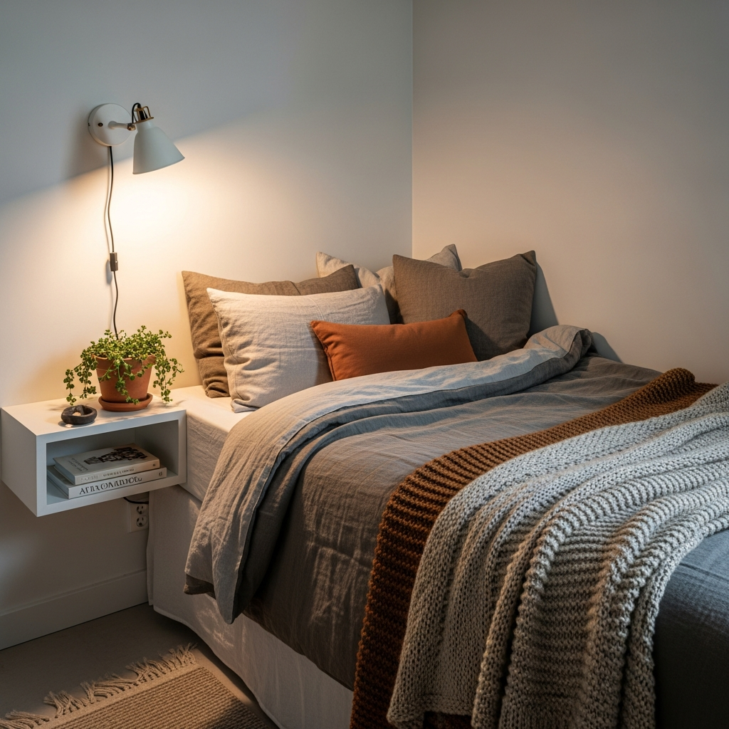 Tucking your bed into a corner can create an incredibly cozy and intentional sleeping nook, freeing up the remaining walls for other furniture like a desk or dresser. Embrace this snugness with soft, layered textiles in warm, inviting tones like terracotta or forest green. A simple platform bed or one with a modest upholstered headboard works well here. Add a small, floating shelf as a minimalist nightstand to keep the floor clear.