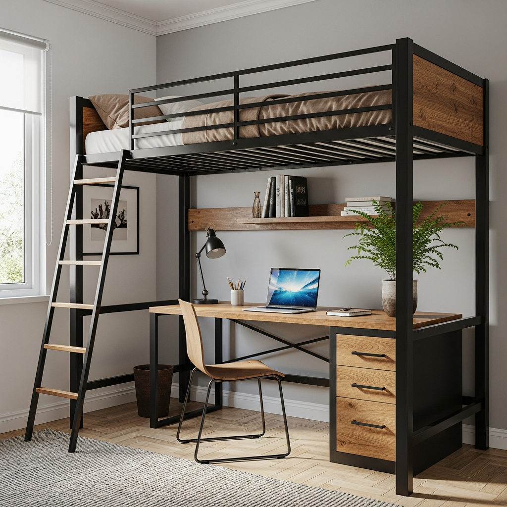 When floor space is scarce, go vertical! A loft bed elevates your sleeping area, opening up the entire footprint underneath for a desk, a cozy reading nook, or even a compact wardrobe. Choose a sturdy design, perhaps in black metal or a light-colored wood, to keep it from feeling too heavy. Maintain a cohesive look with a simple color palette, like white walls and a pop of muted color in textiles or accessories, to make the dual-purpose space feel intentional and harmonious.