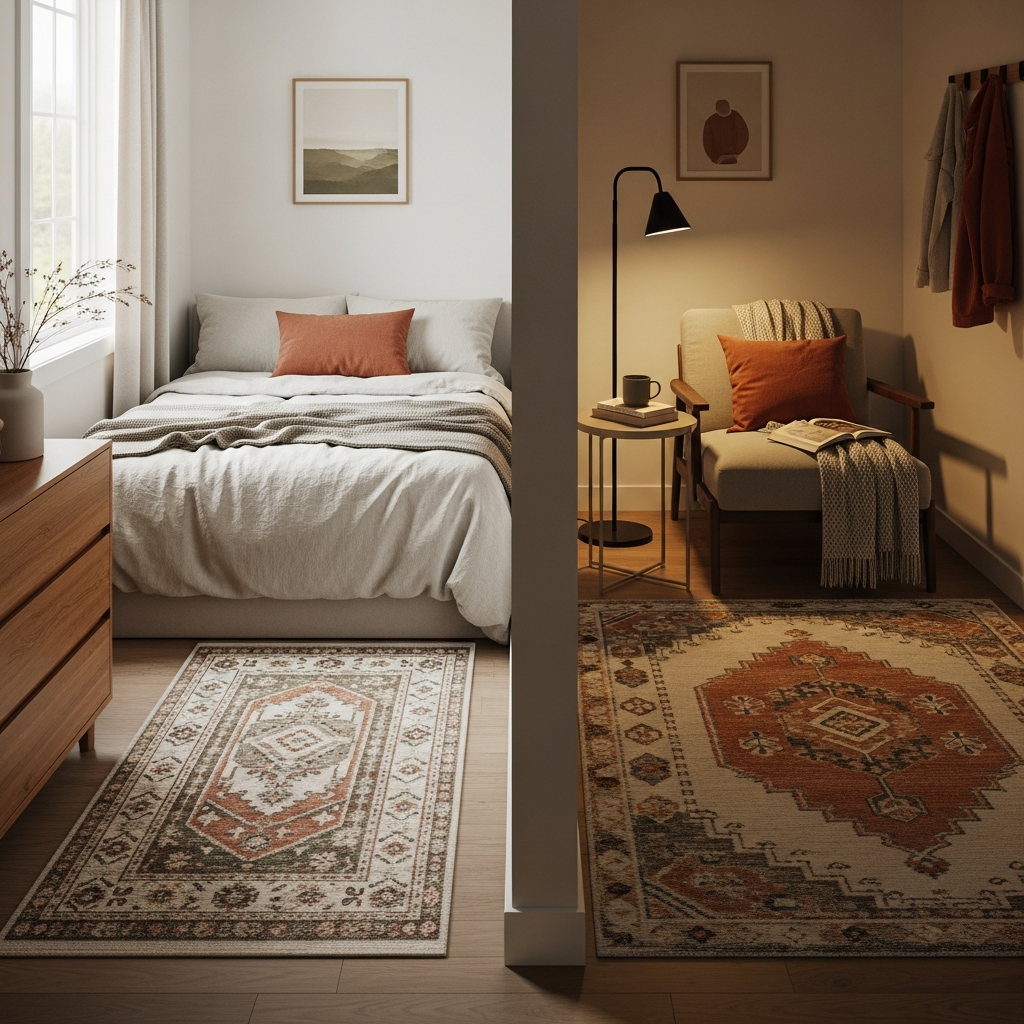In a small bedroom, especially a studio apartment, an area rug can effectively define the sleeping zone without adding physical barriers. Choose a rug that’s large enough for the bed to sit mostly on it, extending beyond the sides to anchor the space. Opt for a pattern or texture that complements your overall decor but stands out just enough to mark the area. Natural fibers like jute or wool in muted geometric patterns work beautifully, adding warmth and visual interest to a minimalist setting.