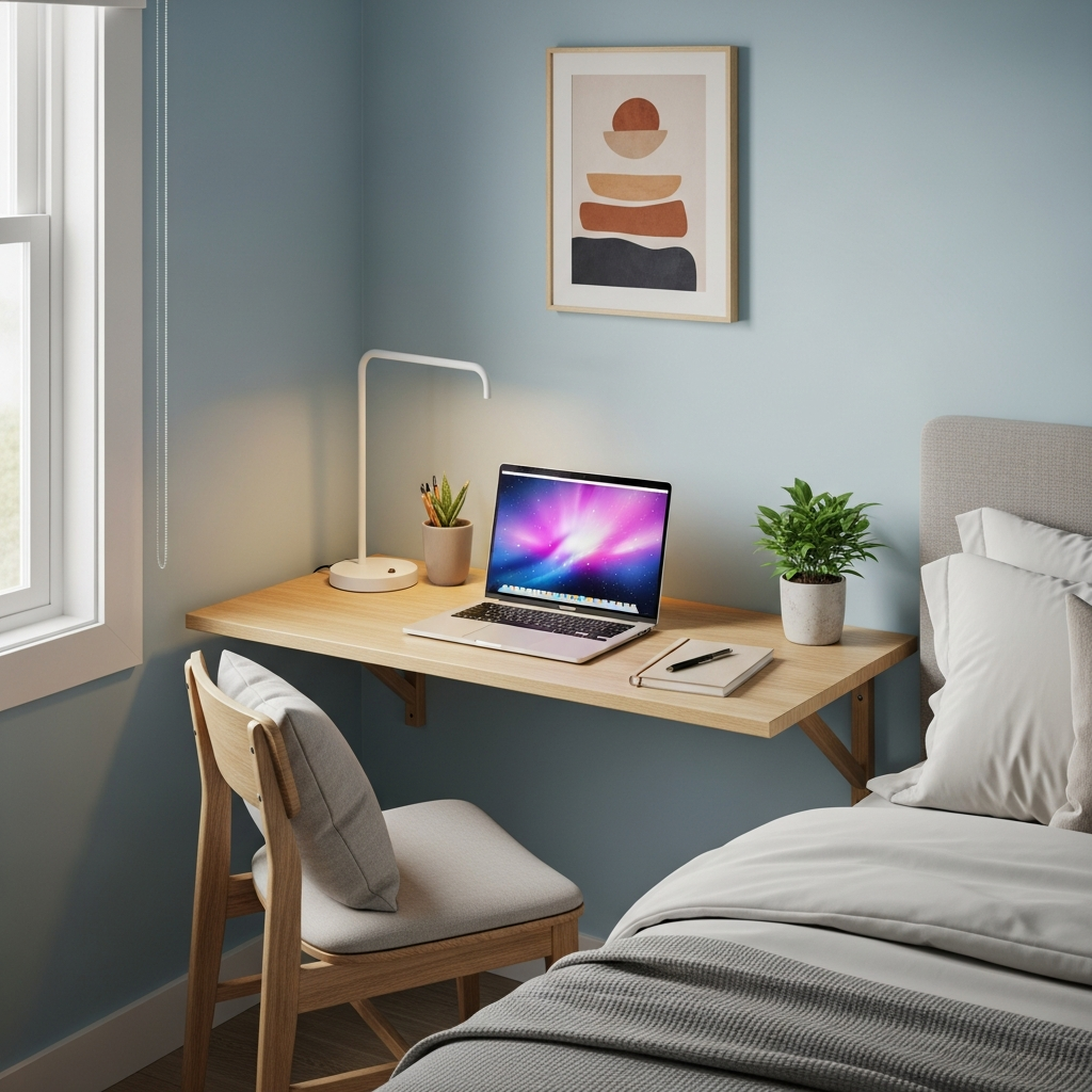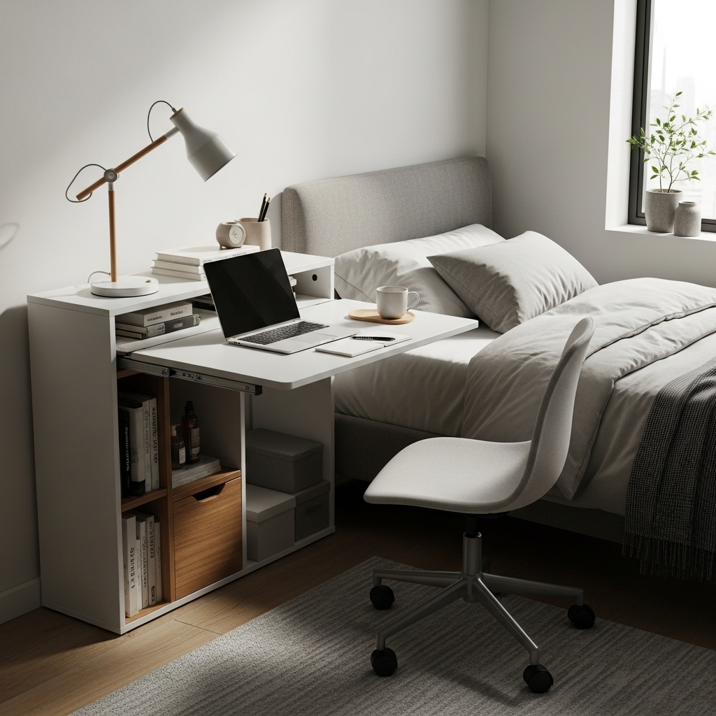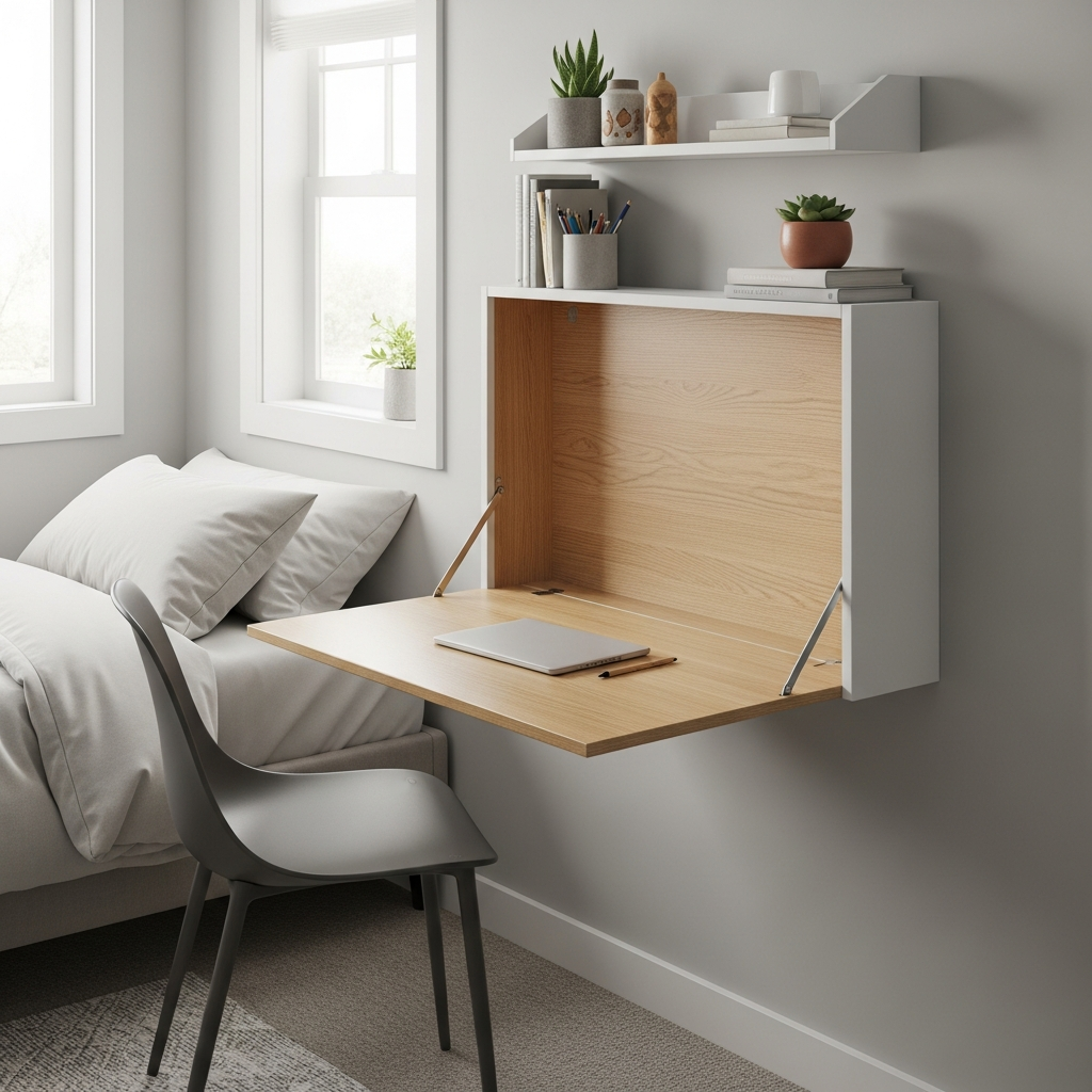 Materials & textures: Wood or laminate for the desk surface, often with hidden shelves or compartments. A simple folding chair or stool can be stored nearby.