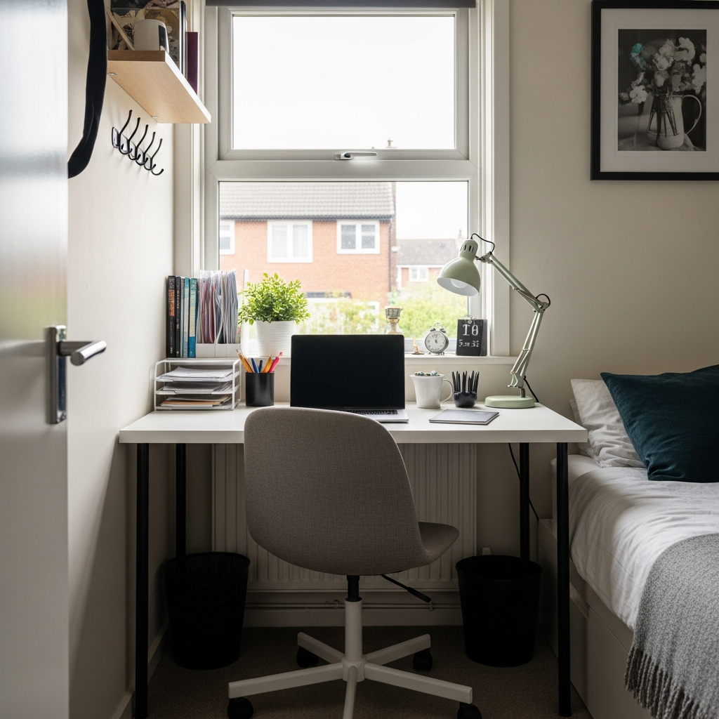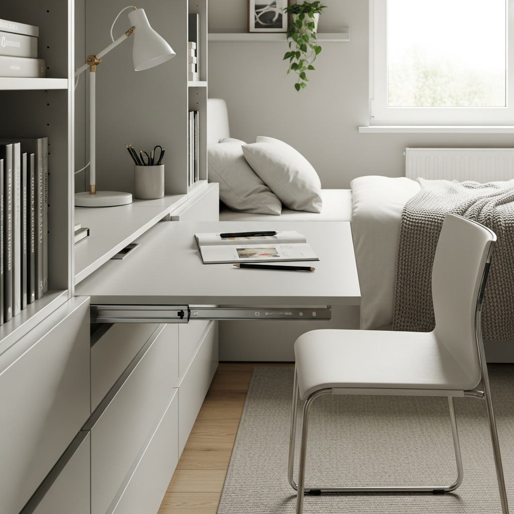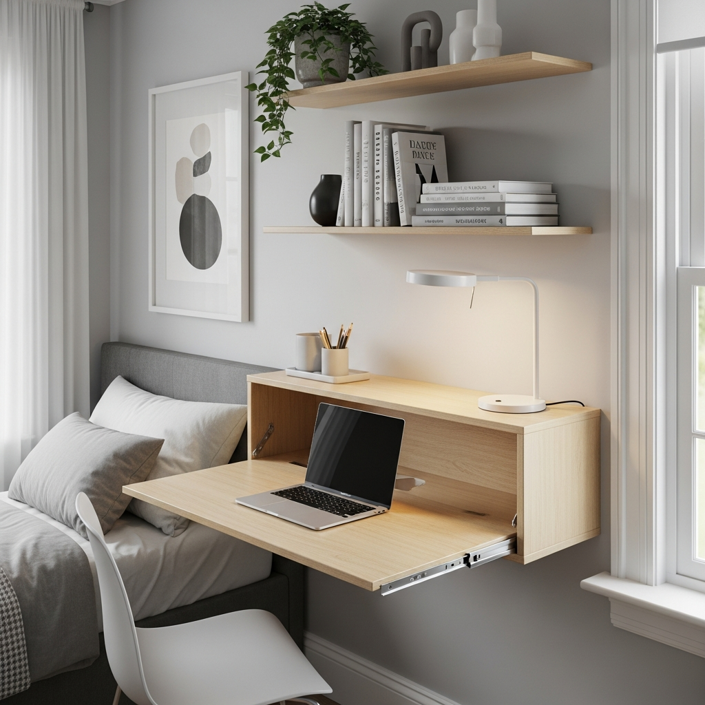 Materials & textures: Wood or laminate for the desk surface, often with hidden shelves or compartments. A simple folding chair or stool can be stored nearby.