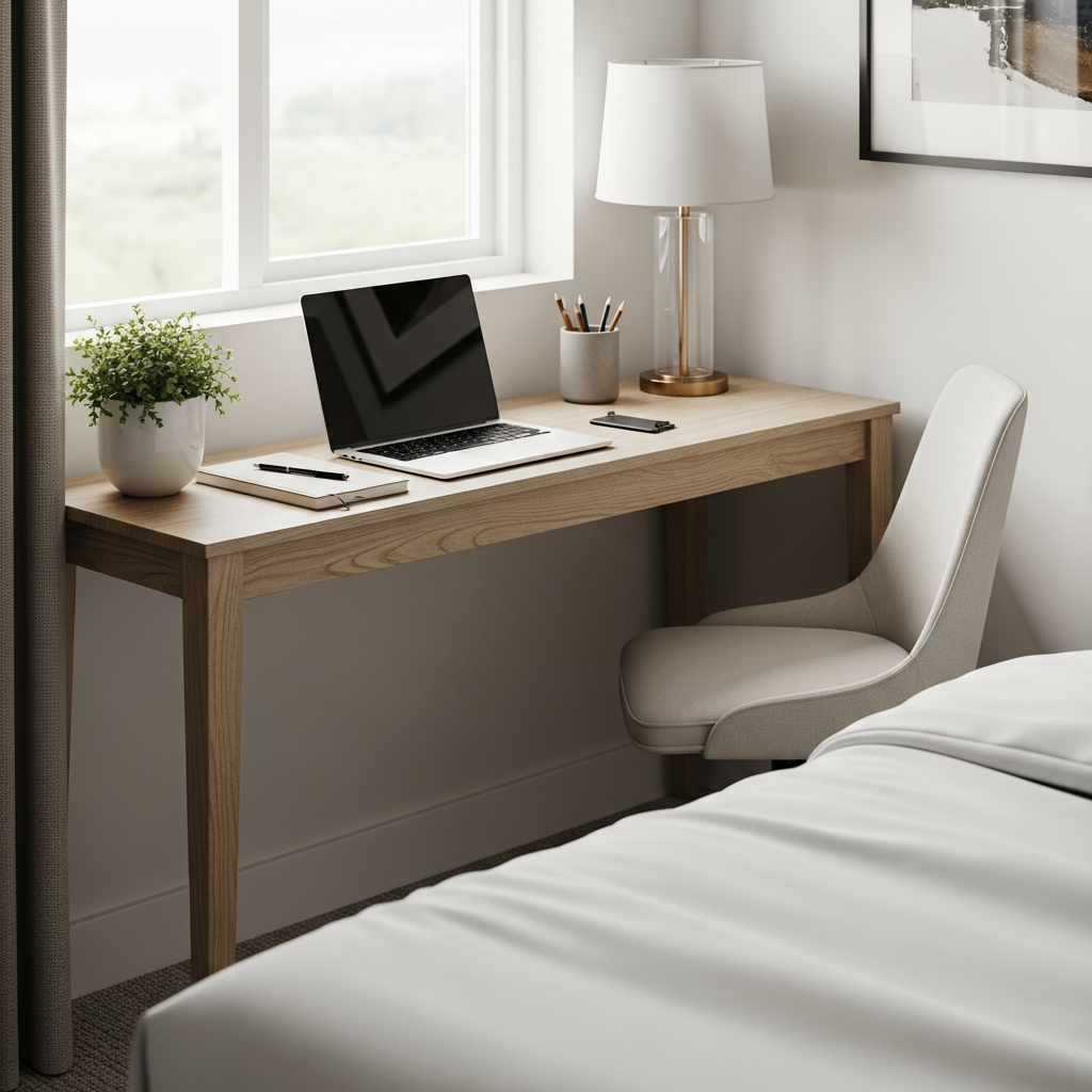 If your work is primarily laptop-based, a slightly larger bedside table or a narrow, tall nightstand can serve as a micro-office. This is ideal for quick tasks and minimal setups.