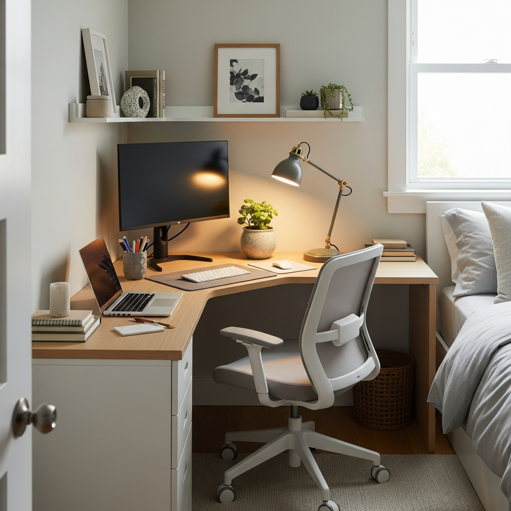 Corners are often underutilized, making them perfect candidates for a small office setup. A triangular or L-shaped desk can fit snugly, providing ample surface area without encroaching too much into the room.