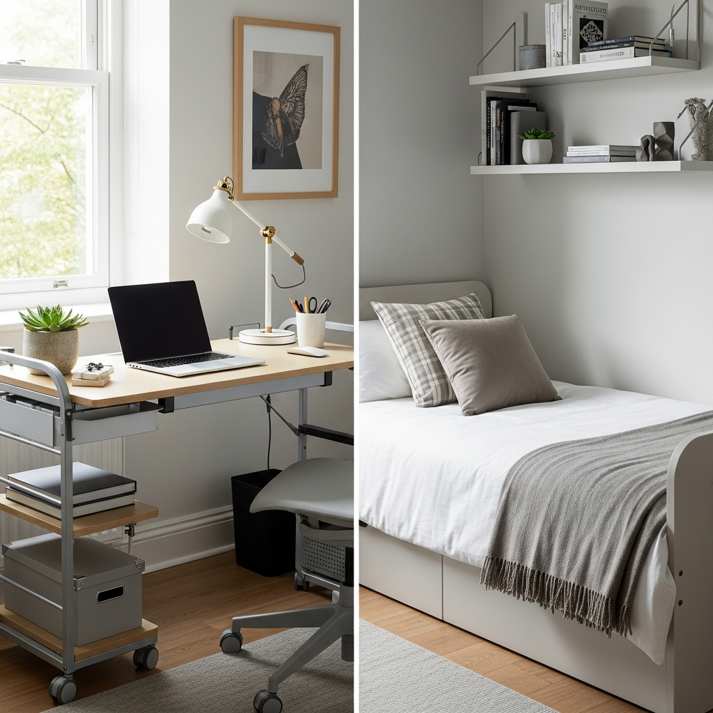 For very small rooms or student dorms, a loft bed creates an entire “room within a room” underneath, perfect for a dedicated workspace.