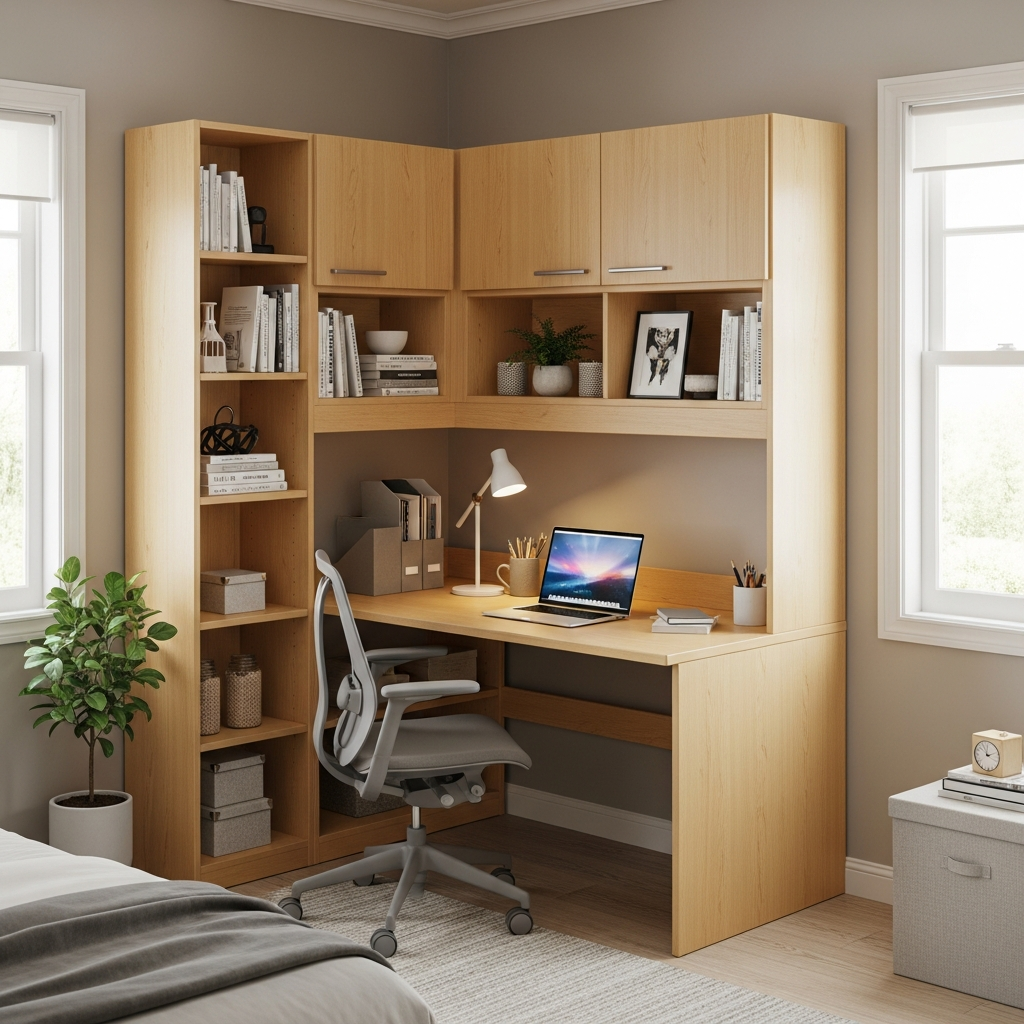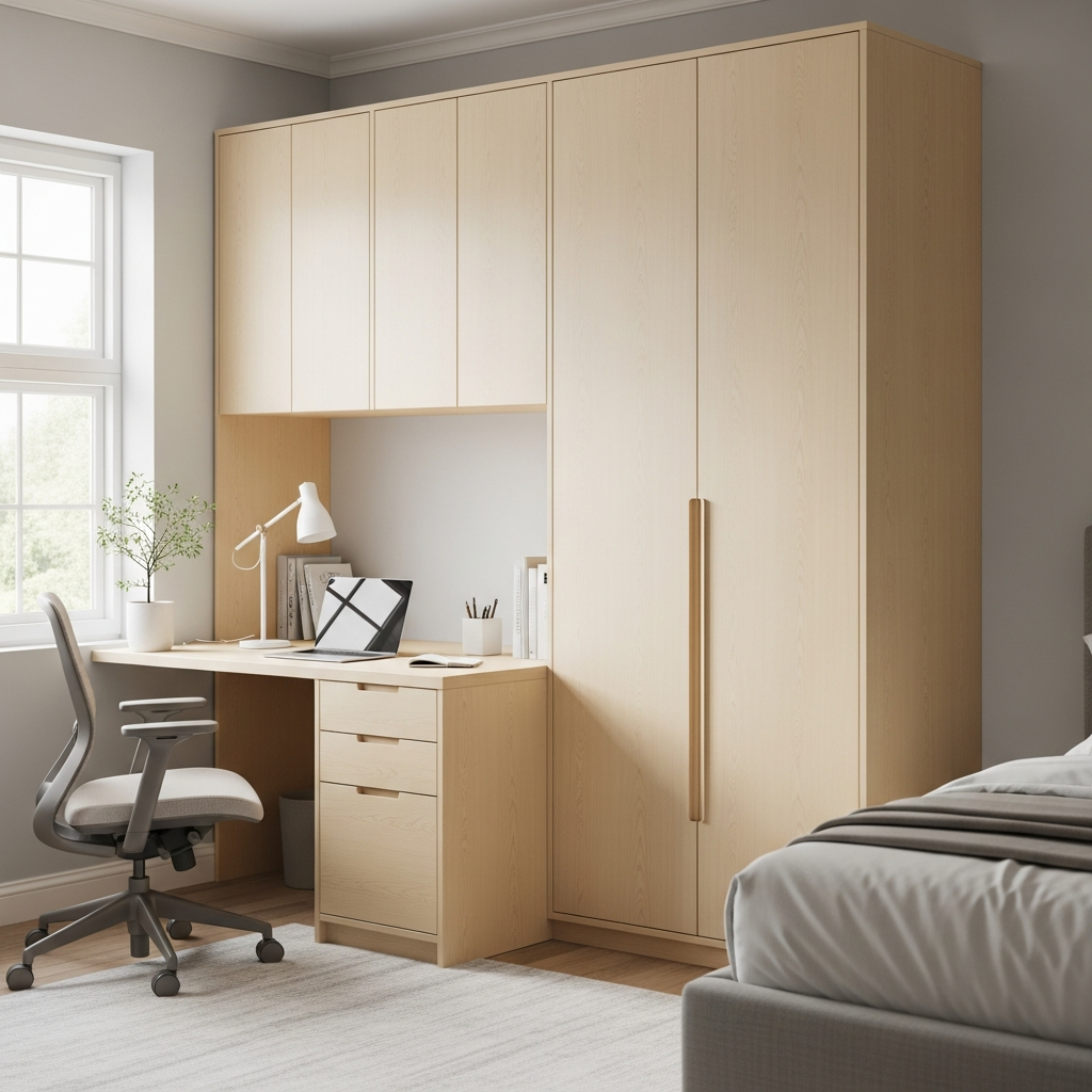 Materials & textures: The desk can be wood, laminate, or even a glass top for a contemporary edge. Use drawers within the wardrobe for hidden office supplies.