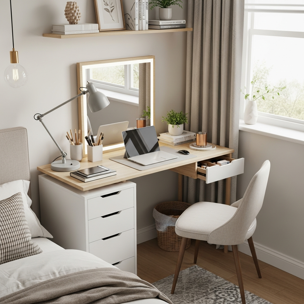 Color palettes: Match the desk material to your wardrobe’s finish for a cohesive look โ be it white laminate, a rich wood veneer, or a painted surface. Keep the overall bedroom palette harmonious and calm.