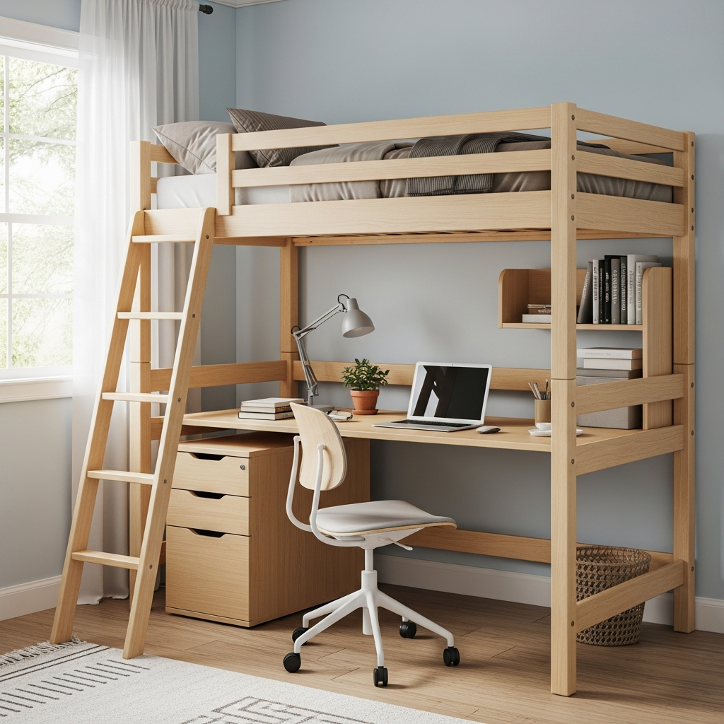 Materials & textures: The bed frame might be metal or wood. The desk surface can be wood or laminate. Incorporate a soft rug underneath the desk for comfort and sound dampening.
